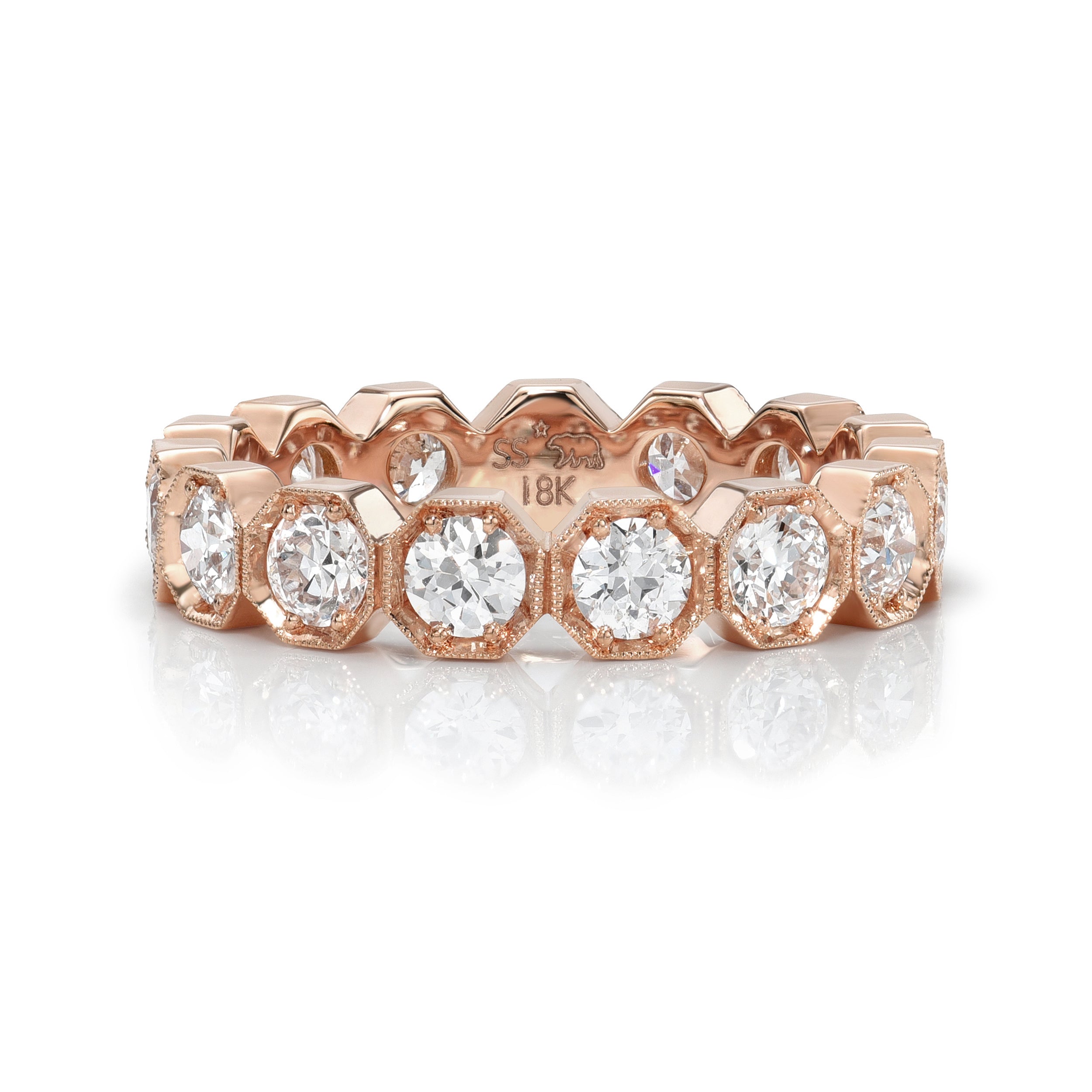The 19th century brought about techniques that advanced the diamond cutting industry and thus, the old European cut diamond was born. With 58 facets, a small table, high crown angle, circular shape, and open culet, the old European cut diamond became the precursor to the modern round diamonds that we see today. Our vintage old European cut diamonds, cut primarily in the 1920s and 1930s, are used in many of our designs, from larger center stones to small, pave set diamonds.
