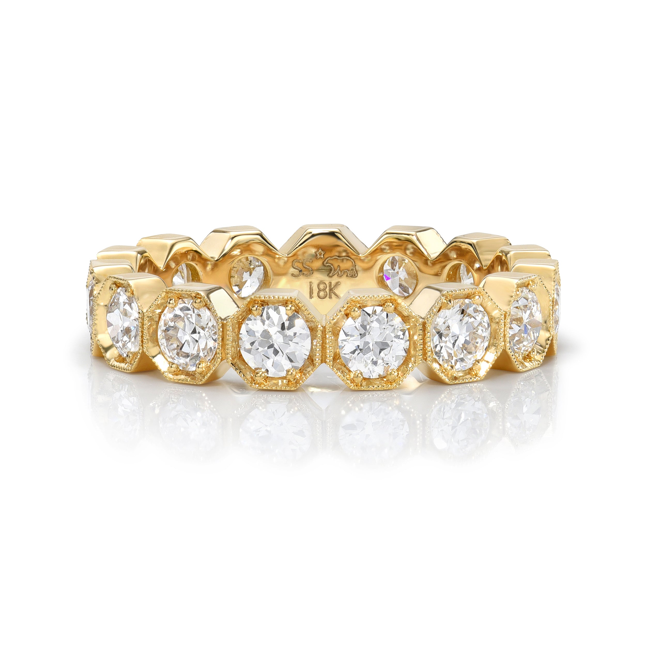 Approximately 1.80ctw G-H/VS-SI old European cut diamonds prong set in a handcrafted octagonal framed eternity band.