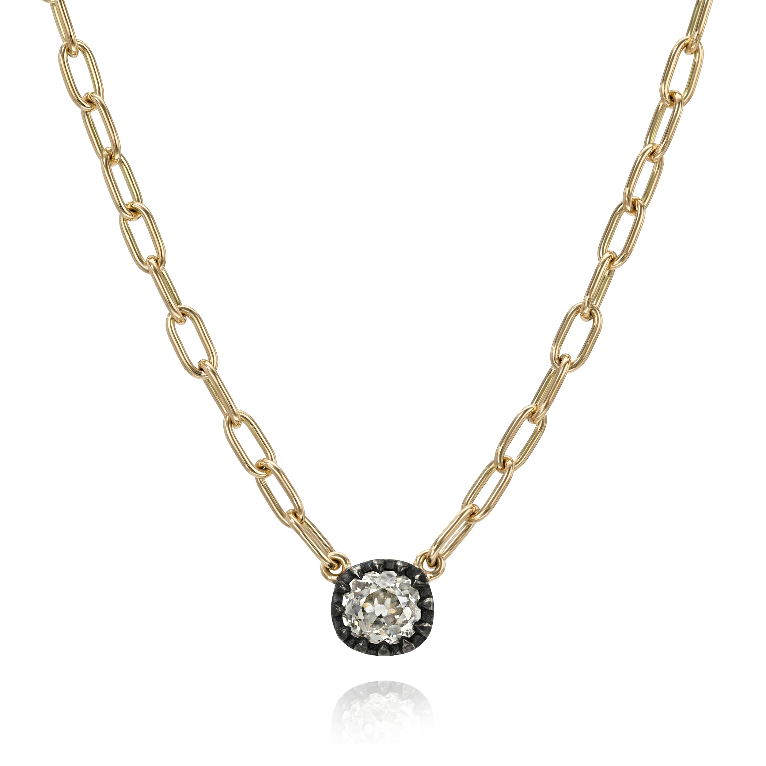 1.13ct O-P/I1 GIA certified antique cushion cut diamond prong mounted in a handcrafted oxidized sterling silver pendant set on our 18K yellow gold Bond chain.