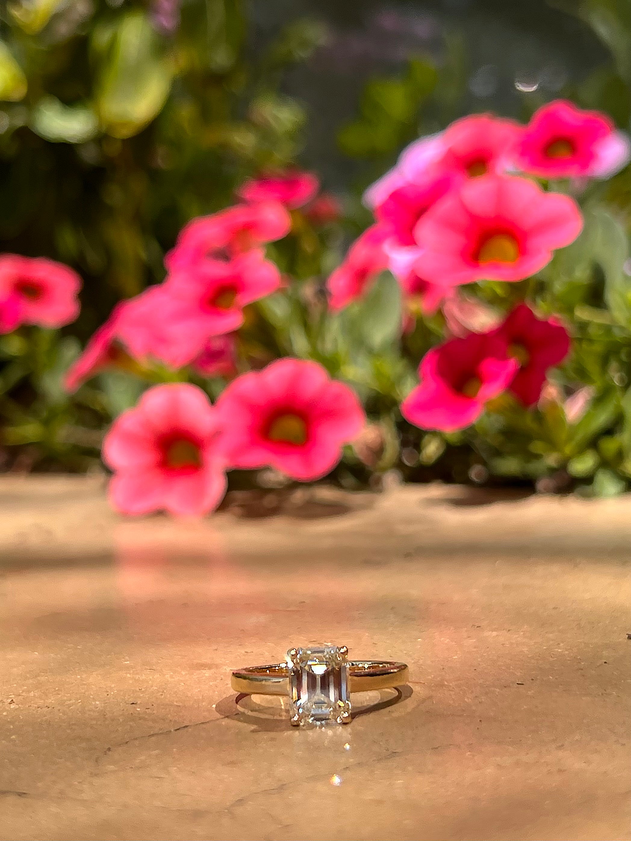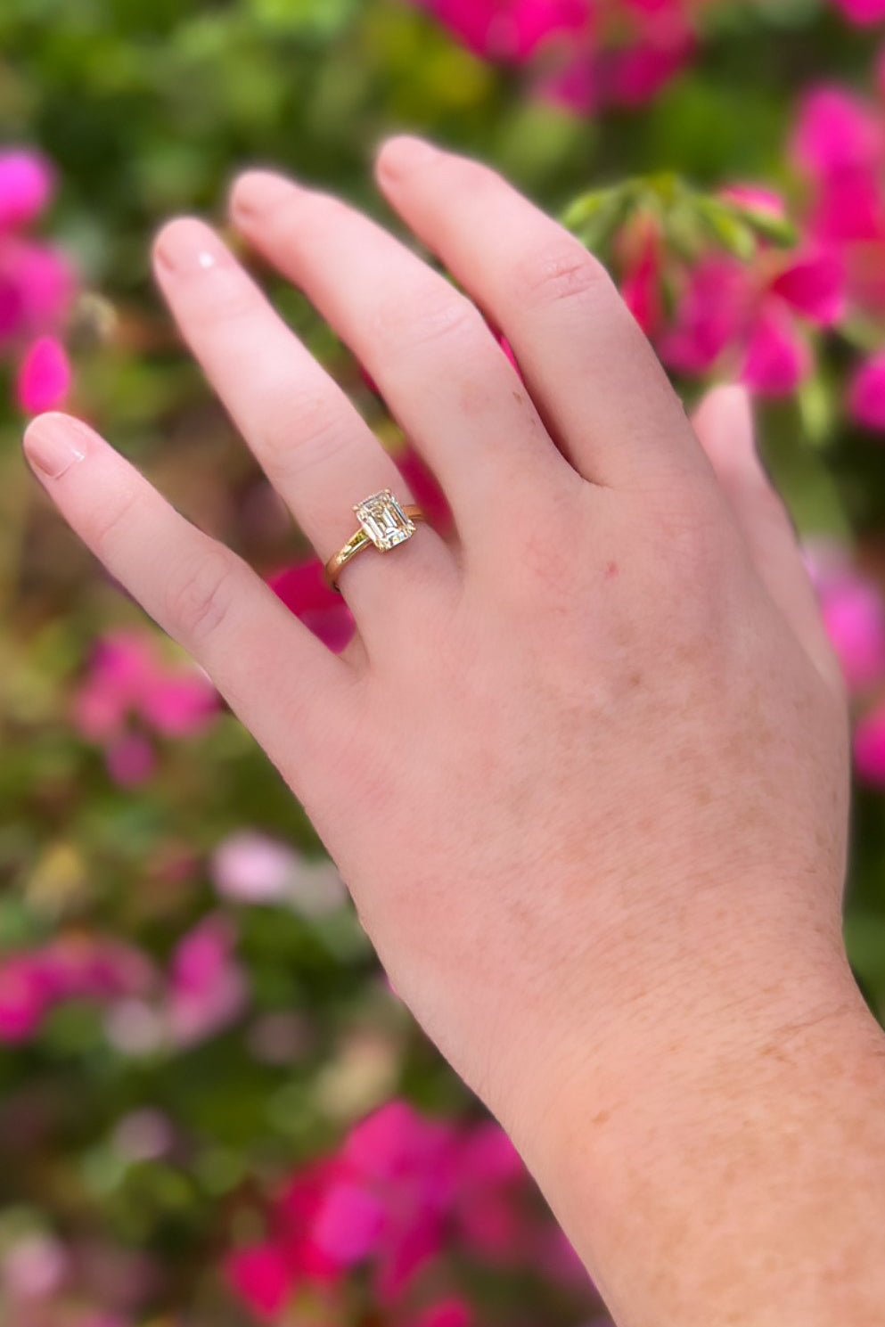 "I adore the timelessness and elegance of an emerald cut stone. I chose an emerald cut solitaire diamond with an 18k gold band and a basket setting. Heidi and Corina taught me about the basket setting (thank goodness) and how it would help protect my diamond throughout my lifetime. It’s perfect."