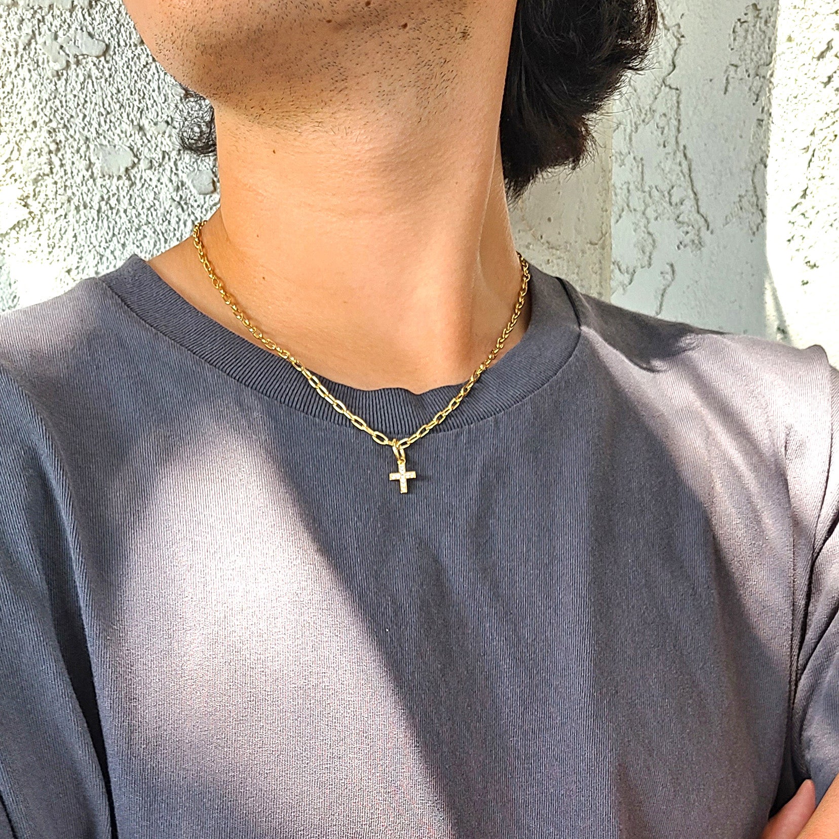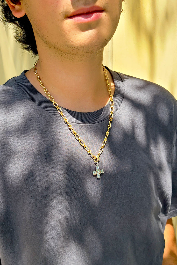 man in a gray shirt wearing a gold chain link necklace with a cross-shaped pendant featuring French cut diamonds