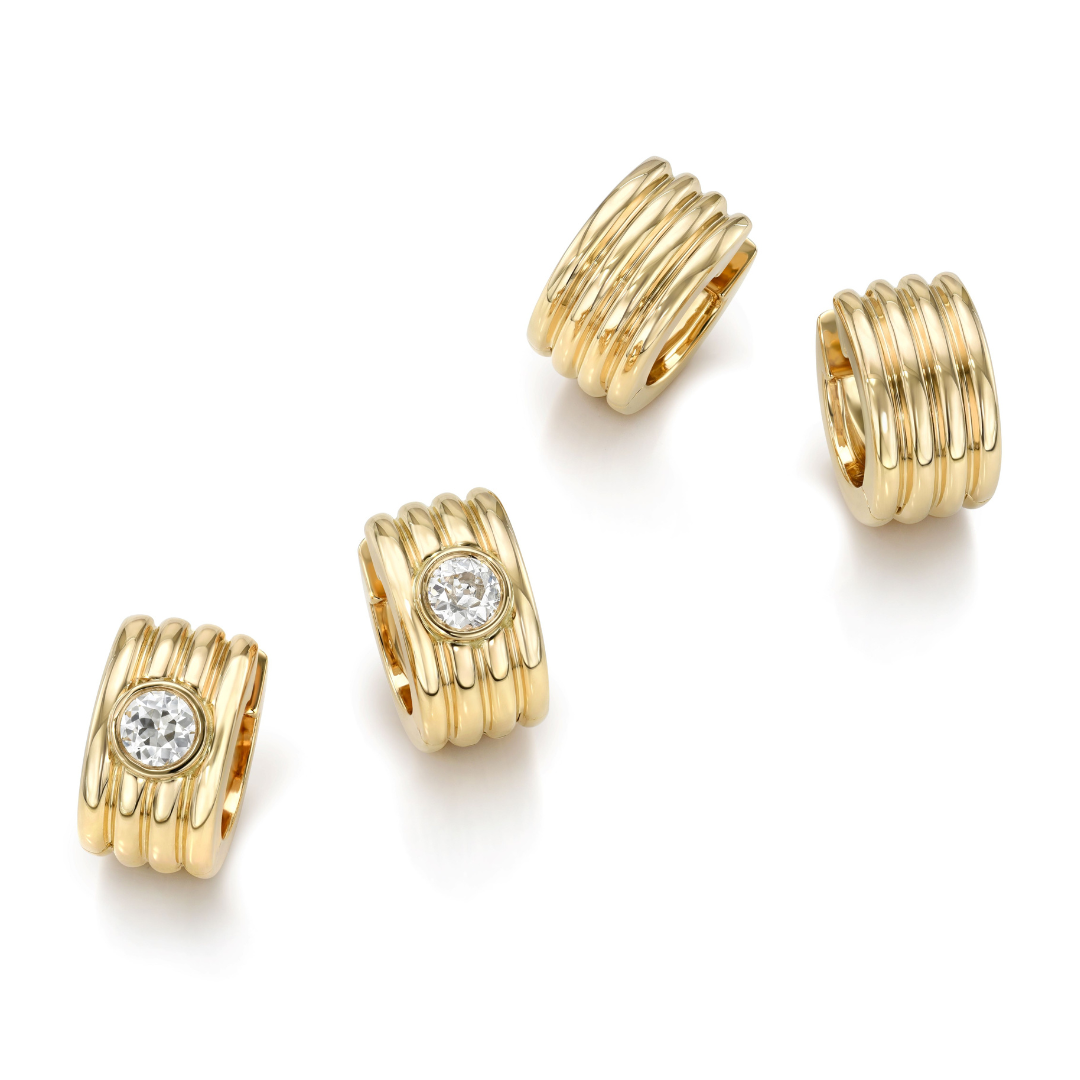 A staple in quiet luxury is a bold, easy to wear earring. Enter our Eleni Huggies. Keep it simple with sleek fluted details or add a bezel set old European cut diamond for a subtle sparkle.