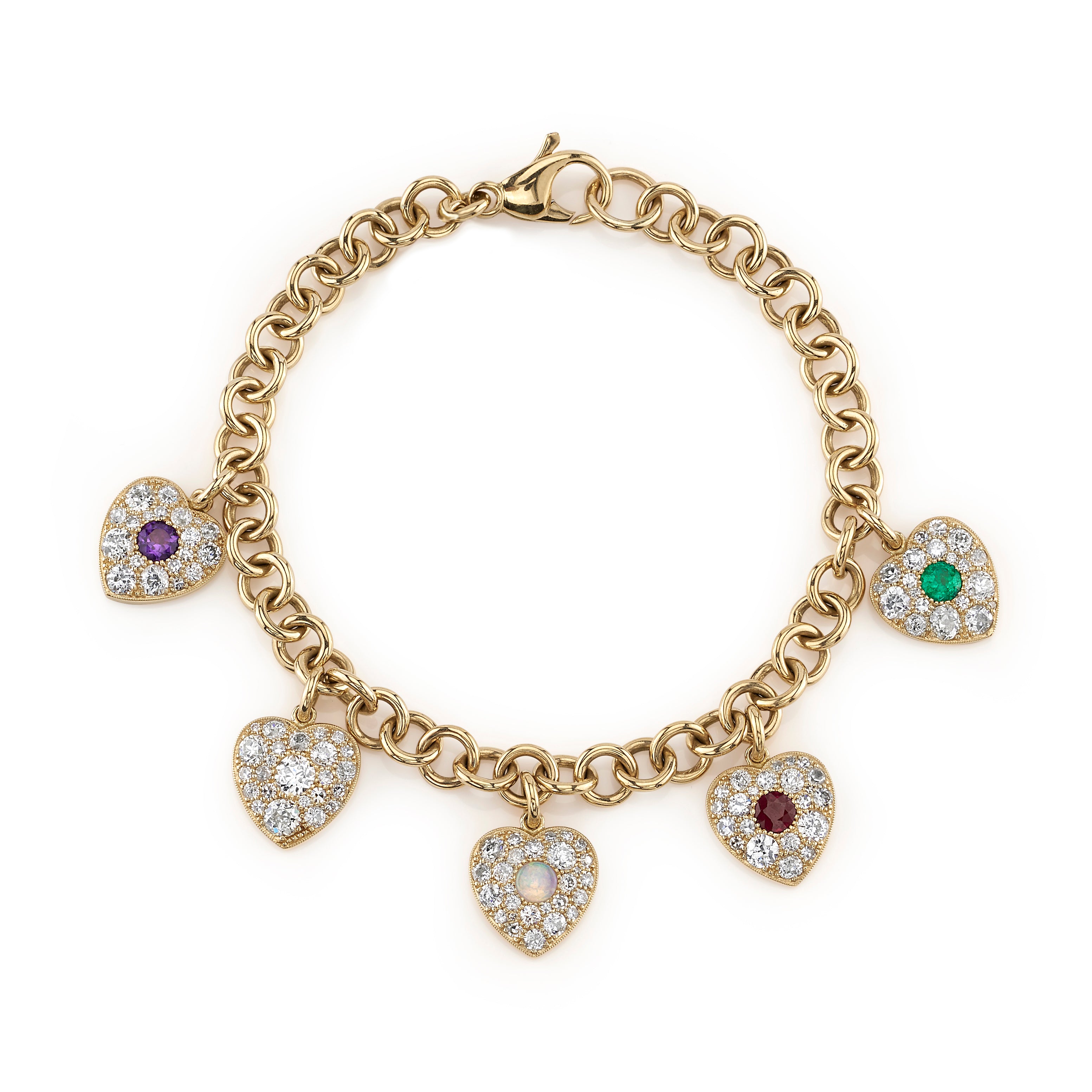 The five hearts are comprised of approximately 4.10ct varying antique cut diamonds surrounding approximately 0.90ctw of mixed color center gemstones set cobblestone style on our handcrafted 18K yellow gold Mini Club bracelet.