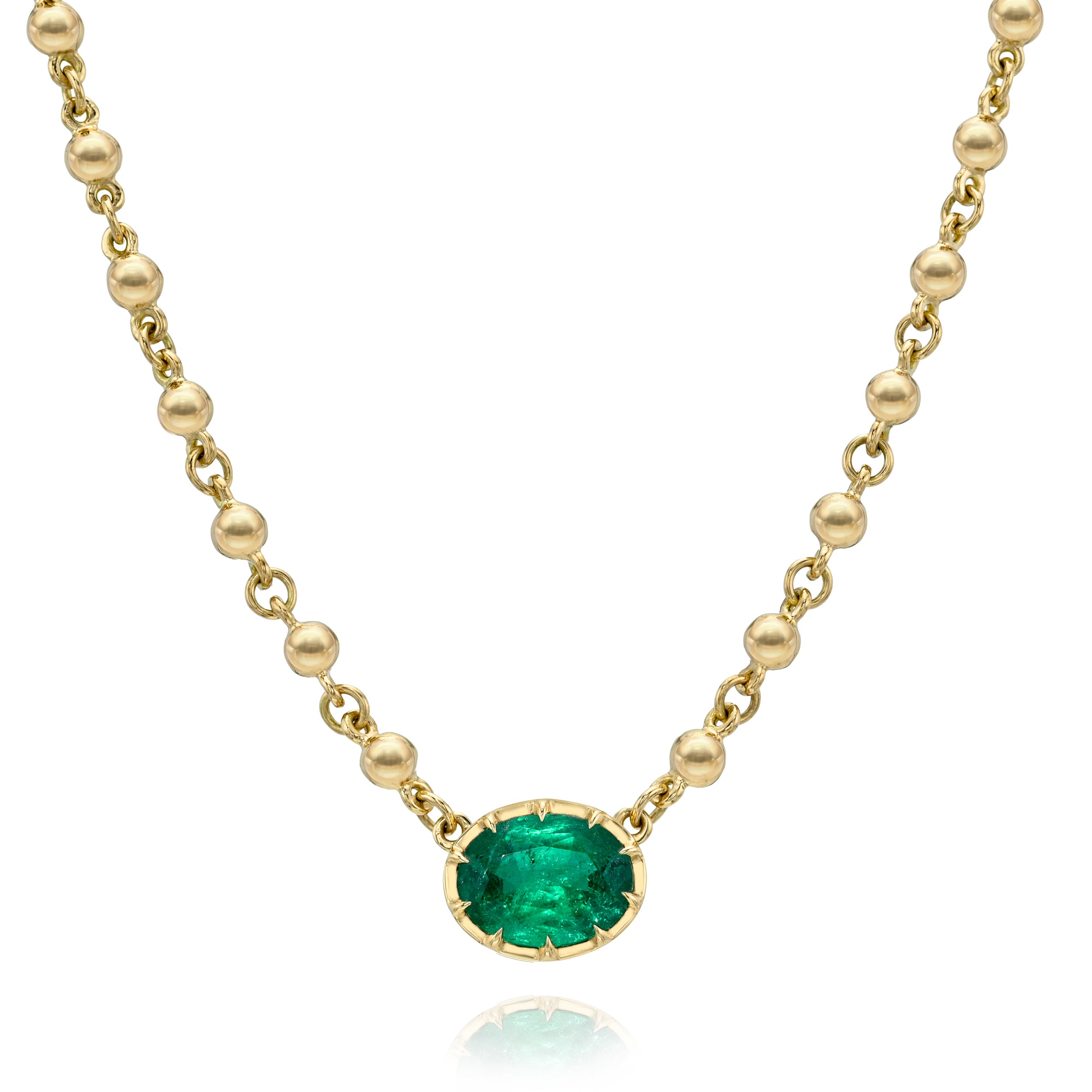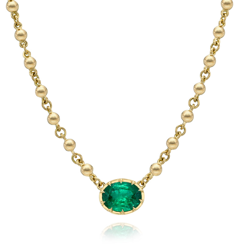 2.36ct GIA certified Zambian oval cut green emerald prong set on our handcrafted 18K yellow gold Rosary chain.