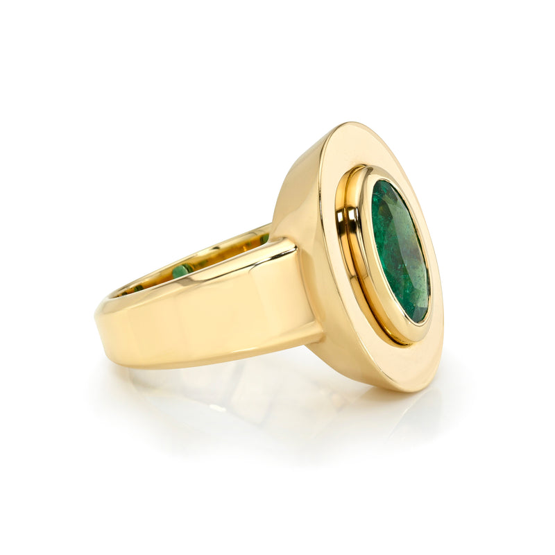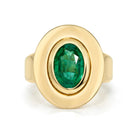 1.58ct GIA certified oval cut green emerald bezel set in a handcrafted 18K yellow gold mounting.