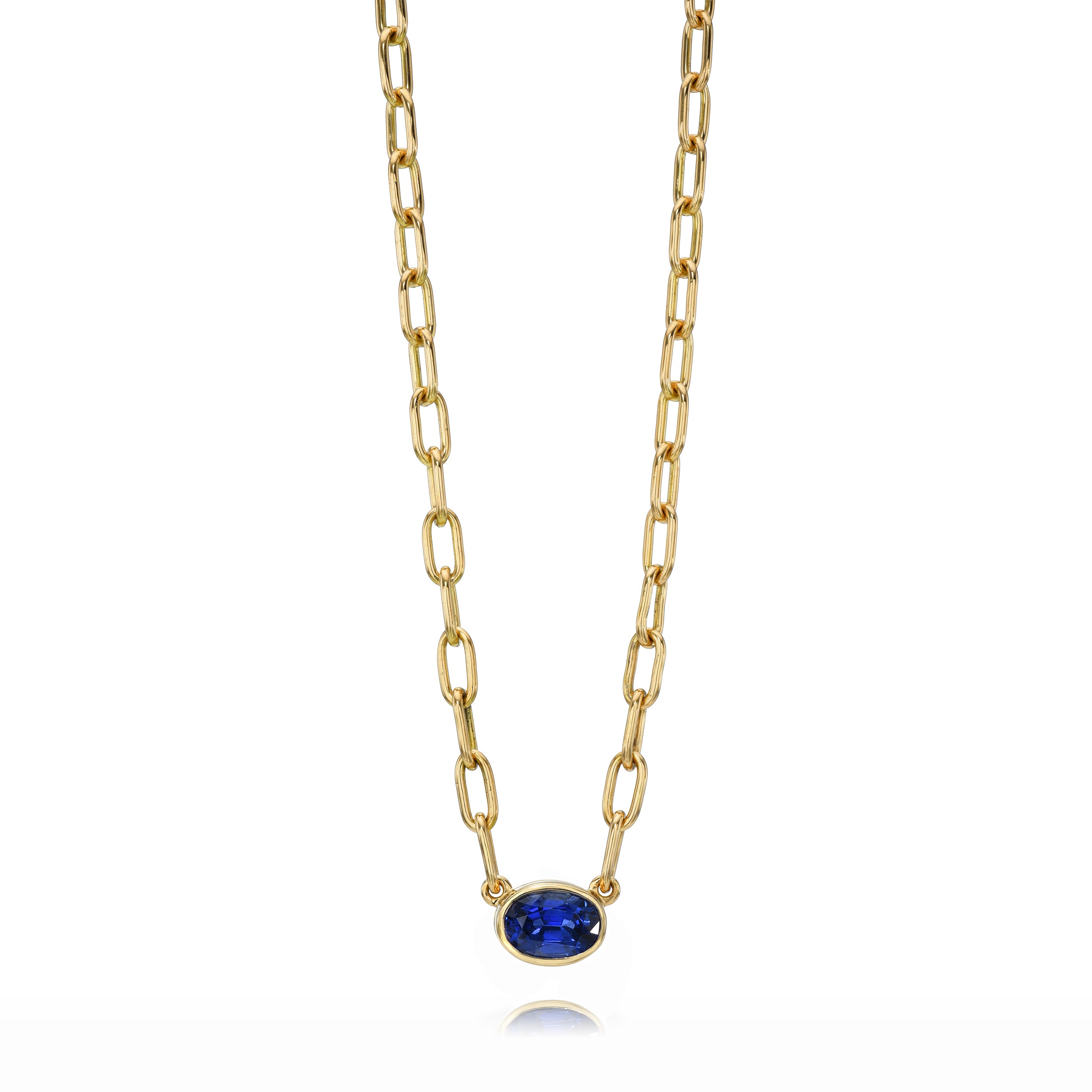 0.60ct oval cut blue sapphire bezel set on our handcrafted 18K yellow gold Bond chain.