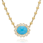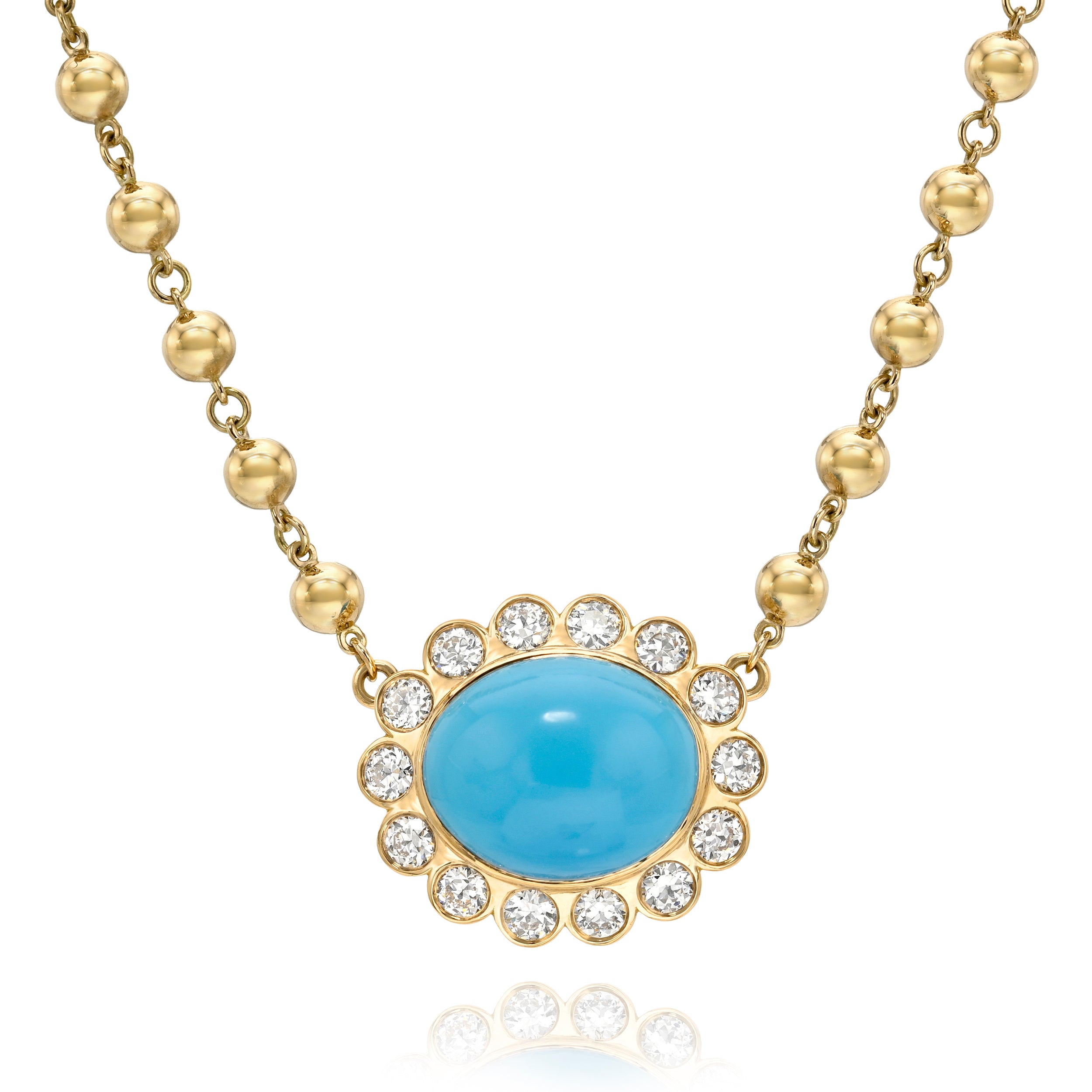 13.80ct oval turquoise cabochon surrounded by 2.22ctw old European cut diamonds bezel set on our handcrafted 18K yellow gold Mirella necklace.