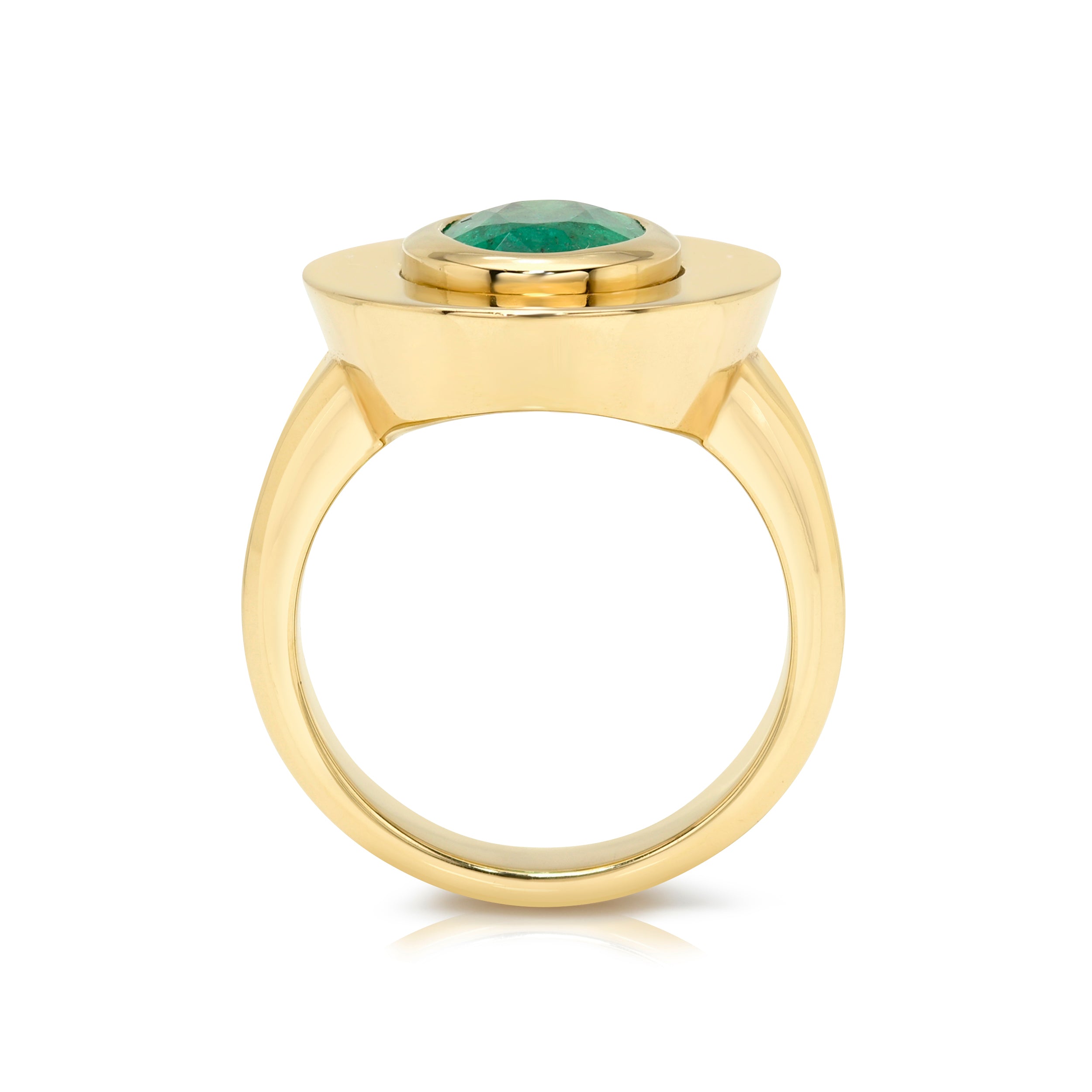 1.58ct GIA certified oval cut green emerald bezel set in a handcrafted 18K yellow gold mounting.