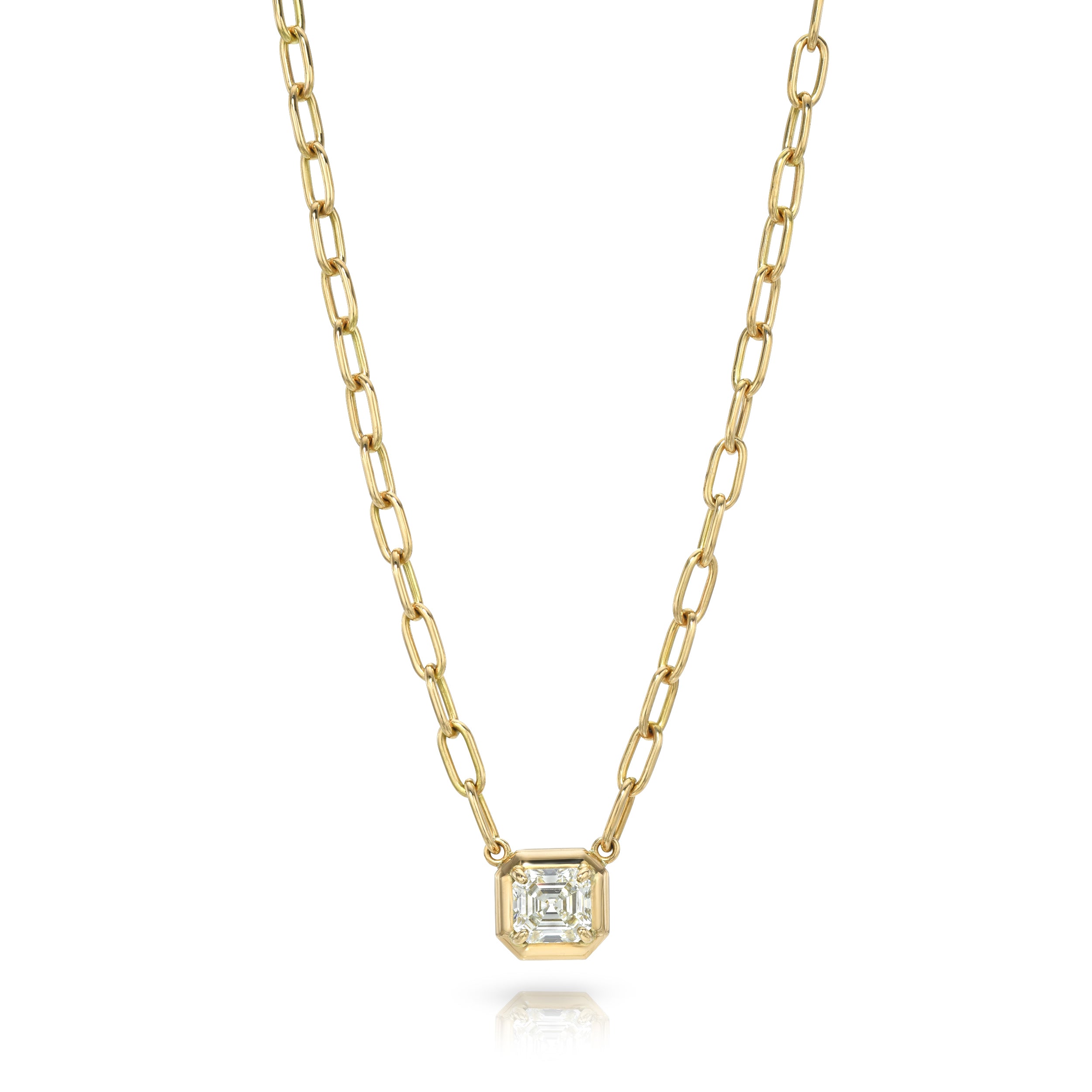 1.08ct O-P/VS2 GIA certified Asscher cut diamond prong set on our handcrafted 18K yellow gold Bond chain.
