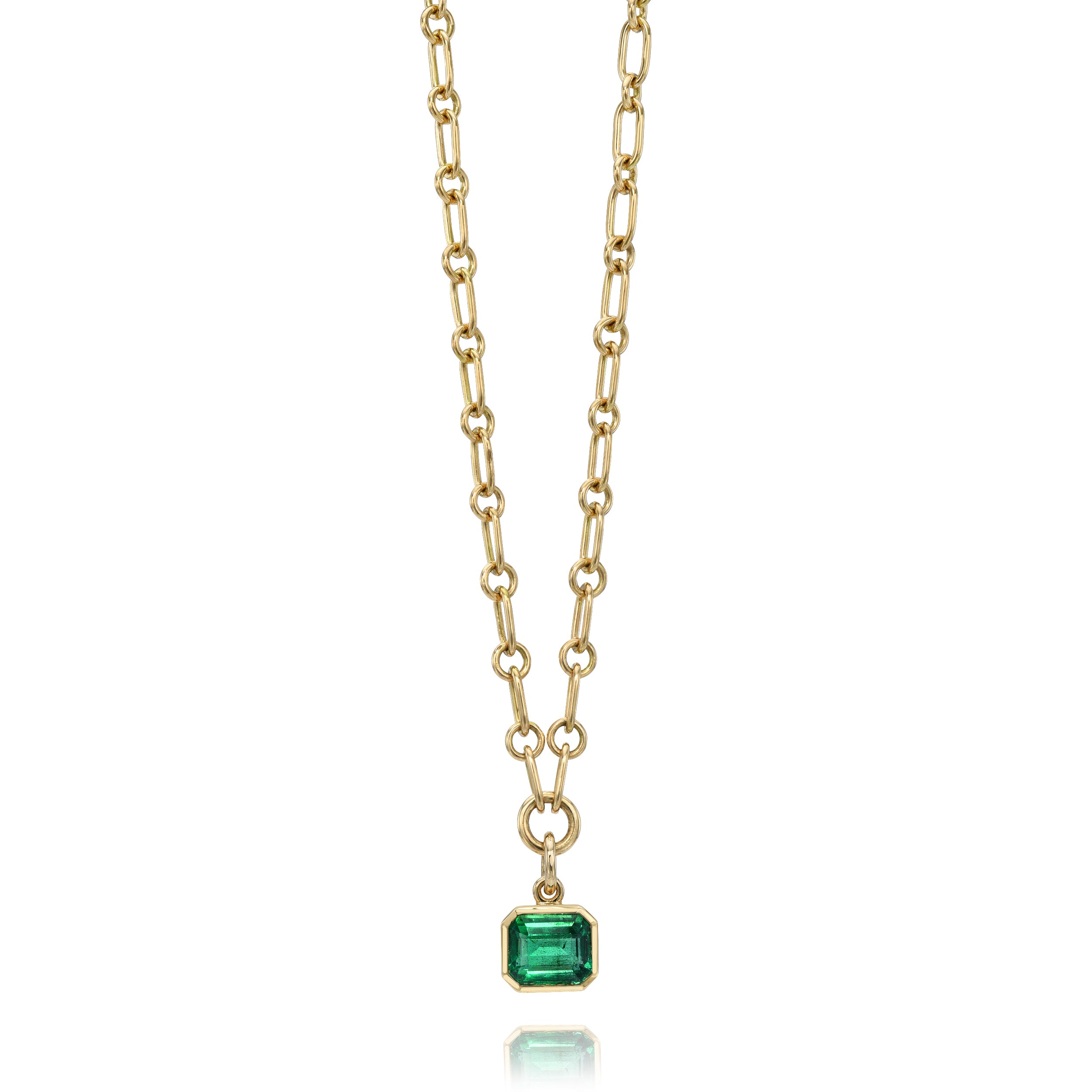 1.77ct GIA certified Zambian Asscher cut green emerald bezel set on our handcrafted 18K yellow gold Mini Lo necklace.
