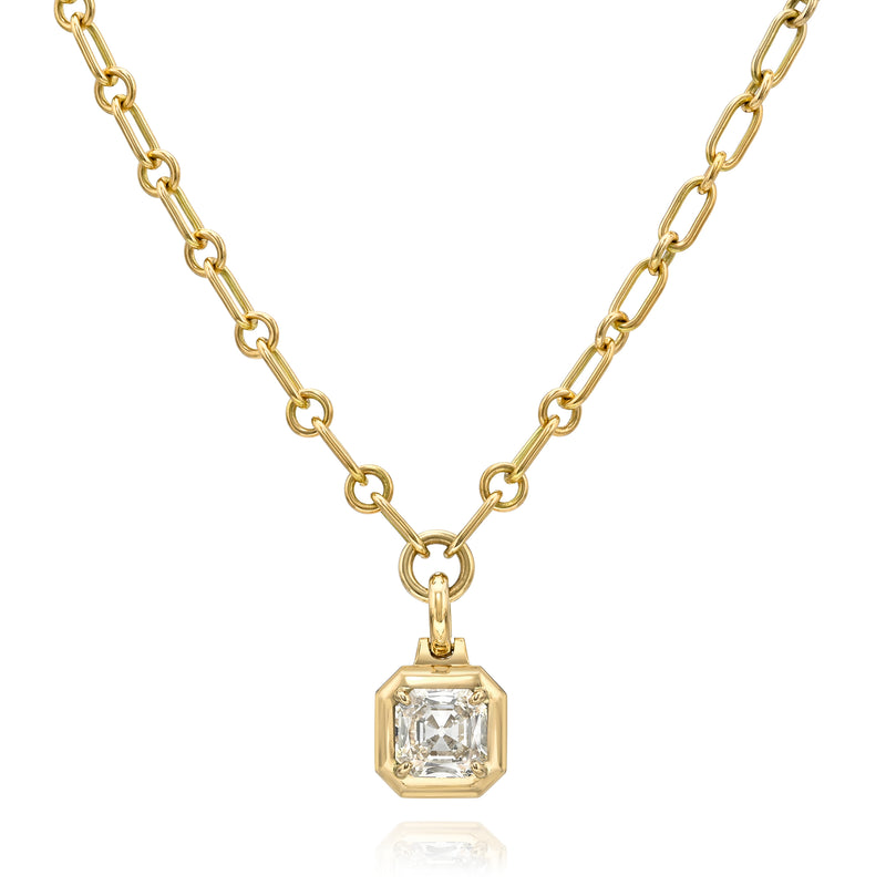 1.17ct K/SI2 GIA certified Asscher cut diamond prong set on our handcrafted 18K yellow gold Mini Lo chain