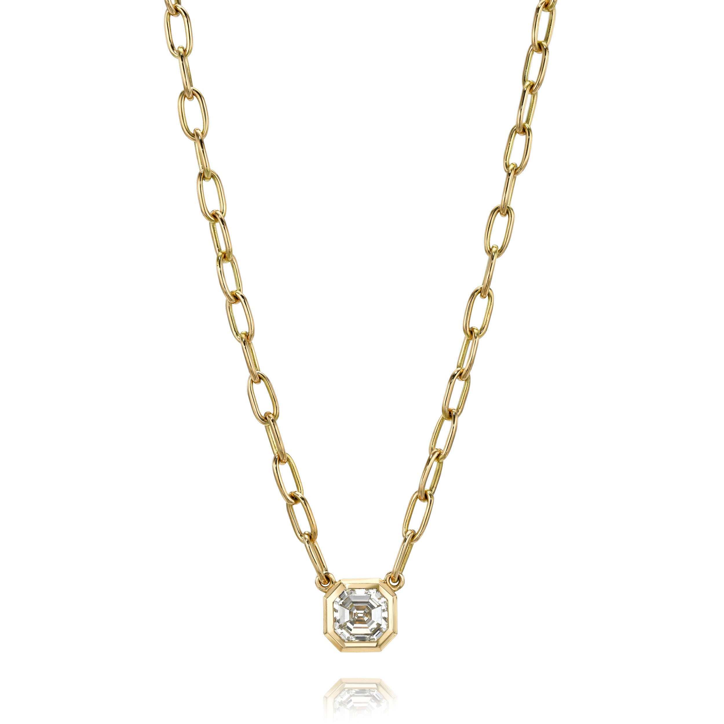 1.20ct L/VS2 GIA certified Asscher cut diamond bezel set on our handcrafted 18K yellow gold Bond chain.