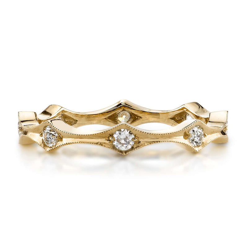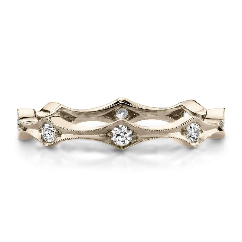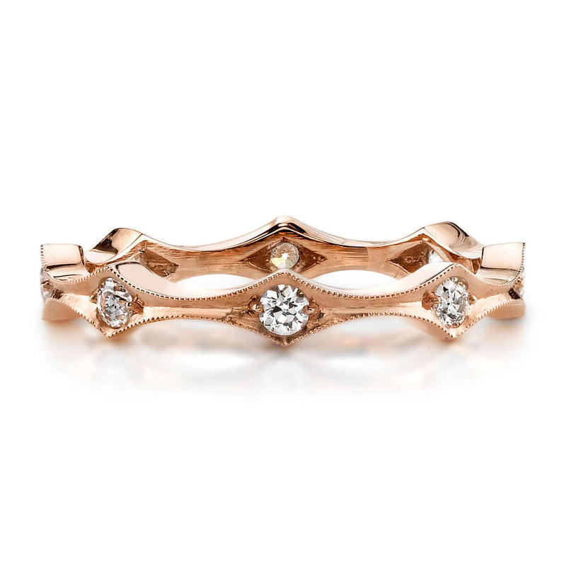 The 19th century brought about techniques that advanced the diamond cutting industry and thus, the old European cut diamond was born. With 58 facets, a small table, high crown angle, circular shape, and open culet, the old European cut diamond became the precursor to the modern round diamonds that we see today. Our vintage old European cut diamonds, cut primarily in the 1920s and 1930s, are used in many of our designs, from larger center stones to small, pave set diamonds.