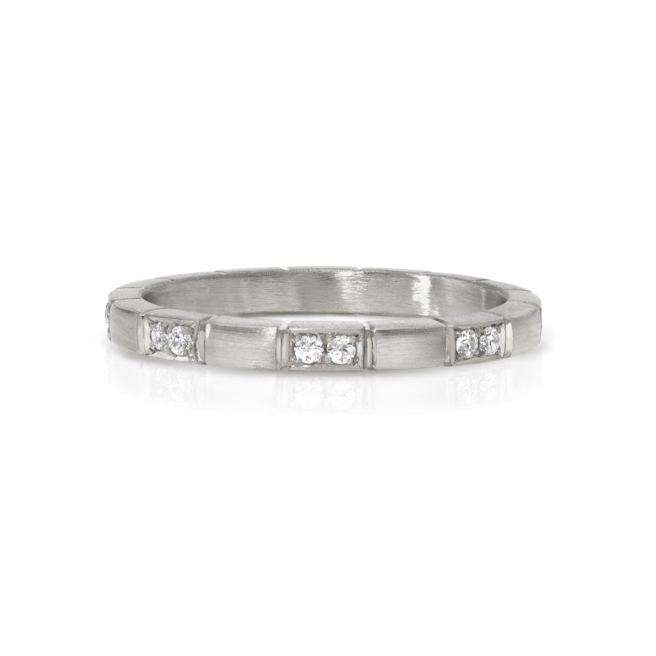 Handcrafted 2.2mm satin finish band with alternating sections featuring 0.15ctw old European cut diamonds.