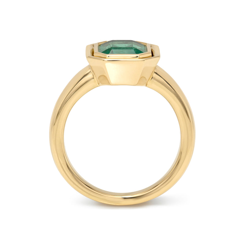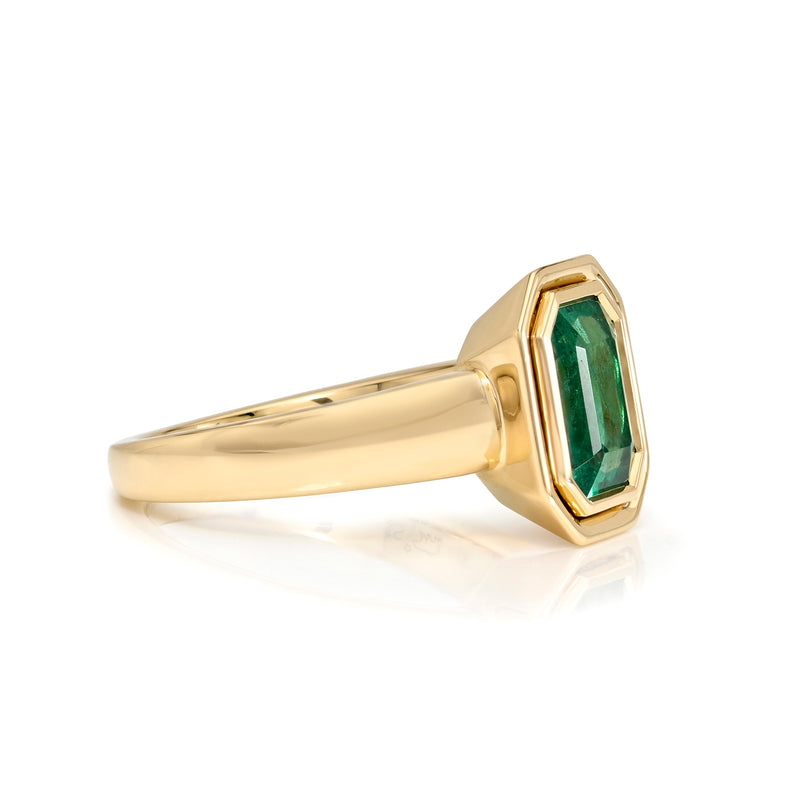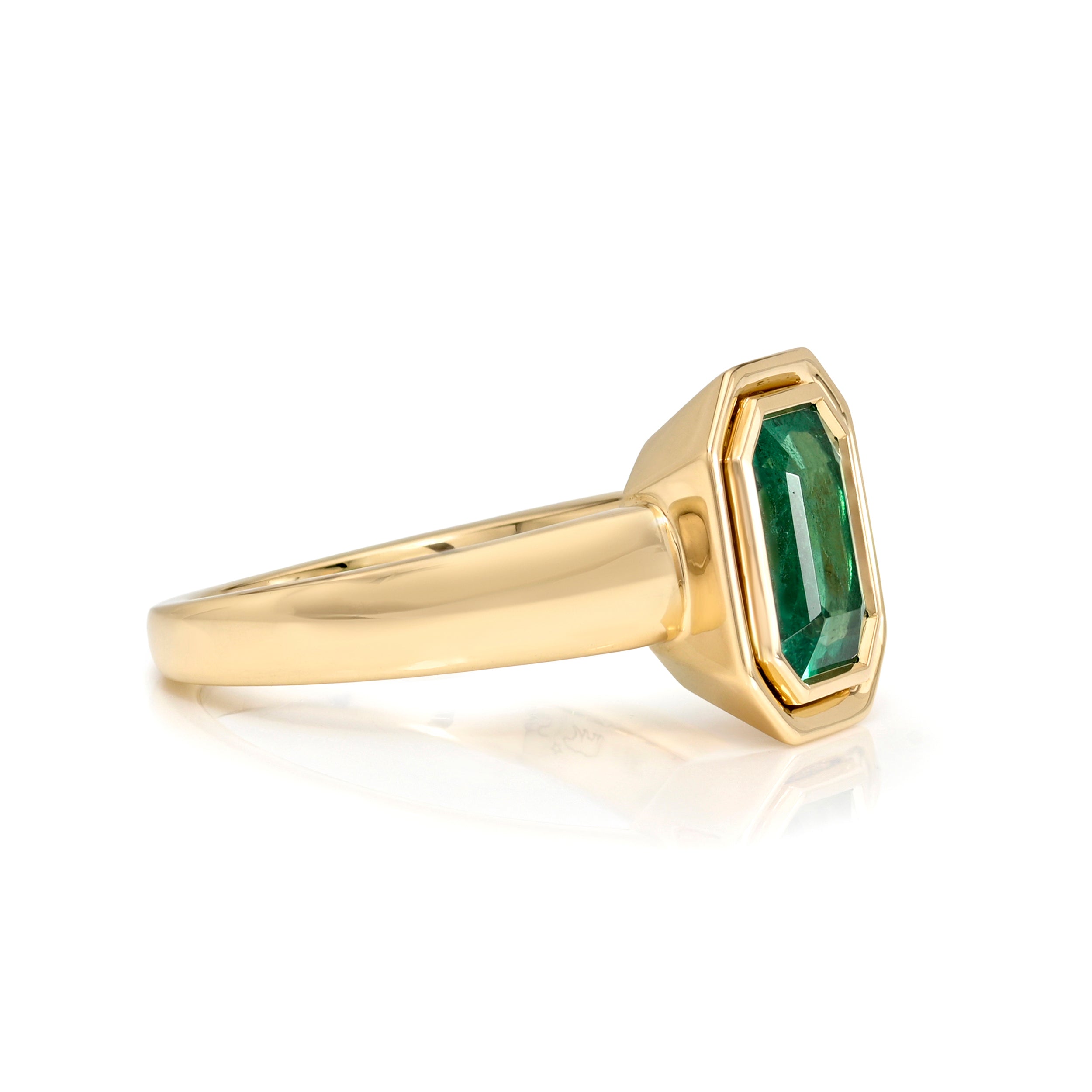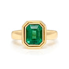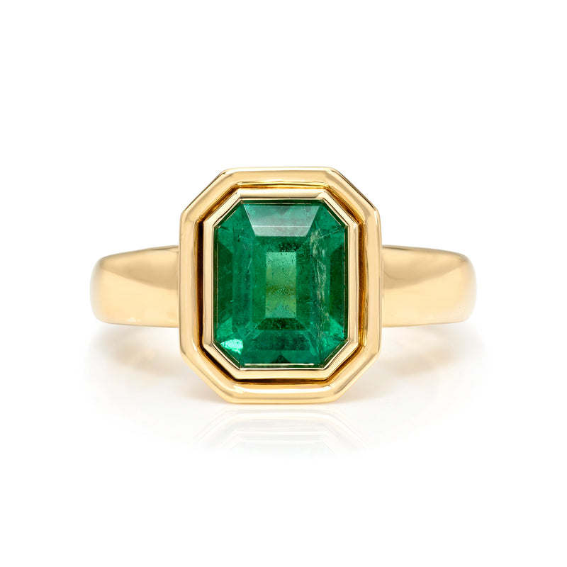2.04ct GIA certified Zambian emerald cut green emerald bezel set in a handcrafted 18K yellow gold mounting.