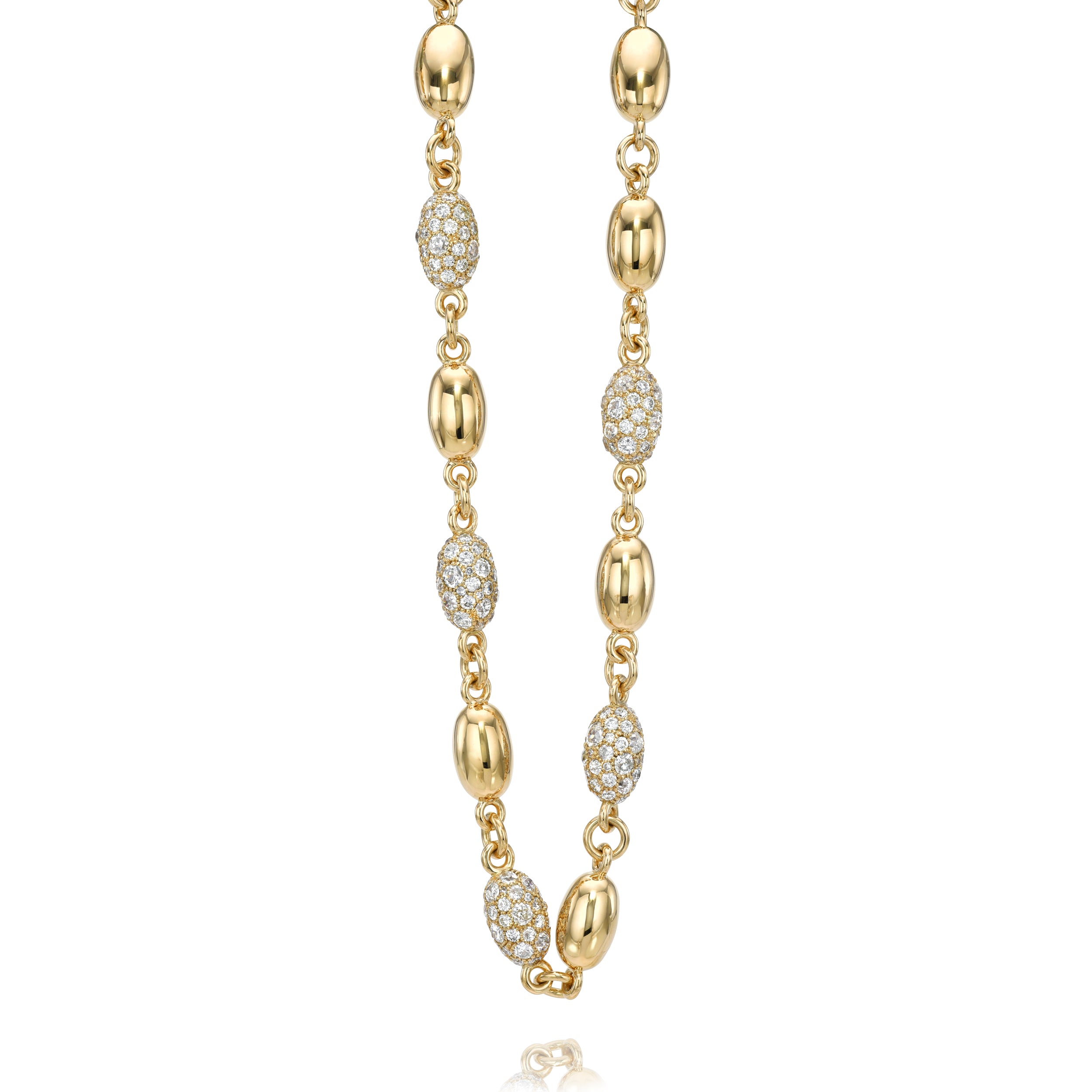10.70ctw varying old cut and round brilliant cut diamonds cobblestone set in a handcrafted, high polish, 18K yellow gold large bead necklace.