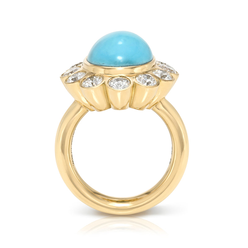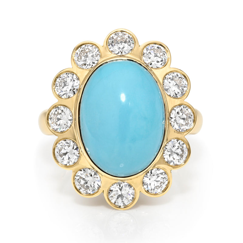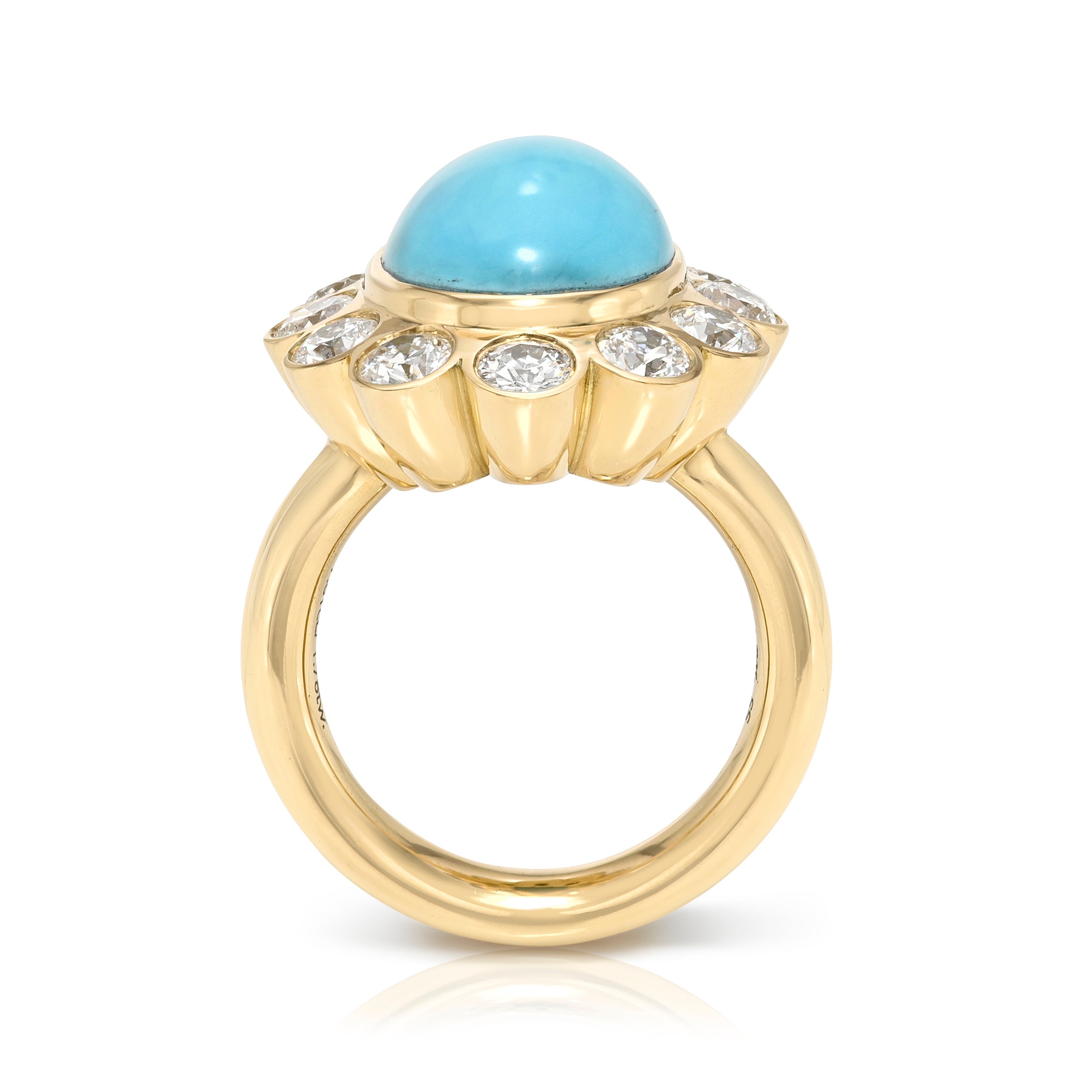 7.61ct oval turquoise cabochon surrounded by a halo of 1.78ctw old European cut accent diamonds set in a handcrafted 18K yellow gold mounting.