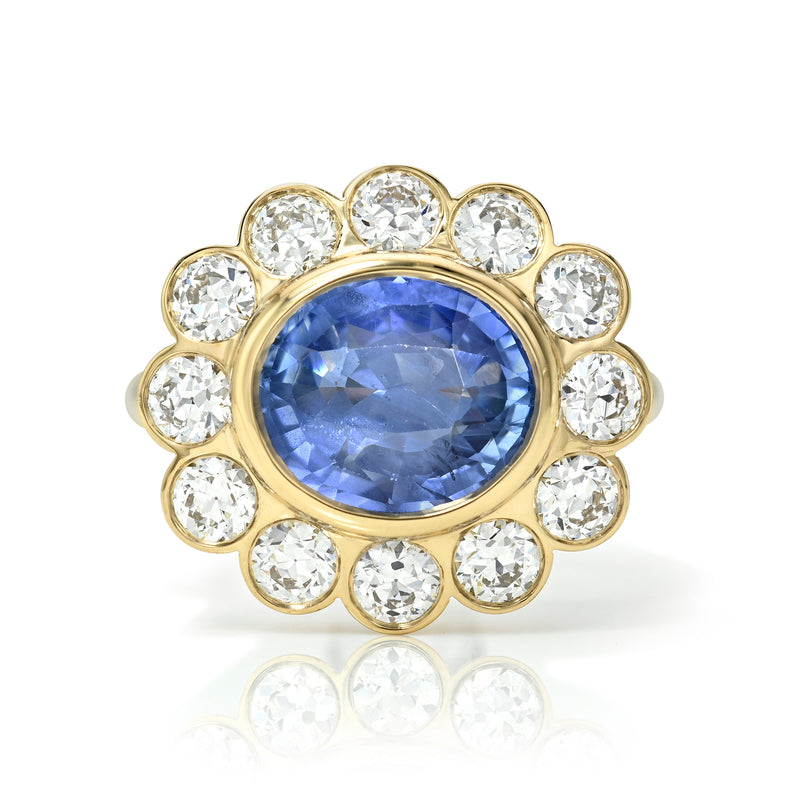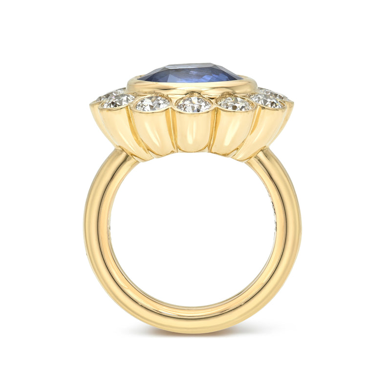 5.19ct GIA certified oval cut blue sapphire surrounded by a halo featuring 2.15ctw old European cut accent diamonds set in a handcrafted 18K yellow gold mounting.