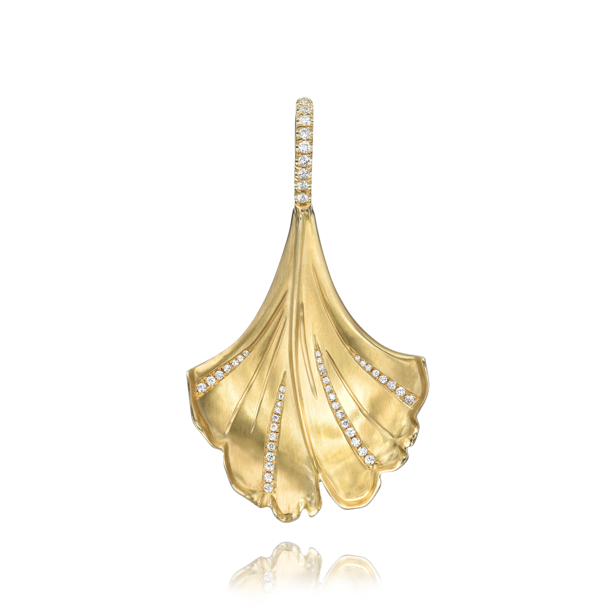 Approximately 0.45ctw old European cut diamonds pavé set in a handcrafted 18K yellow gold gingko leaf shaped pendant.