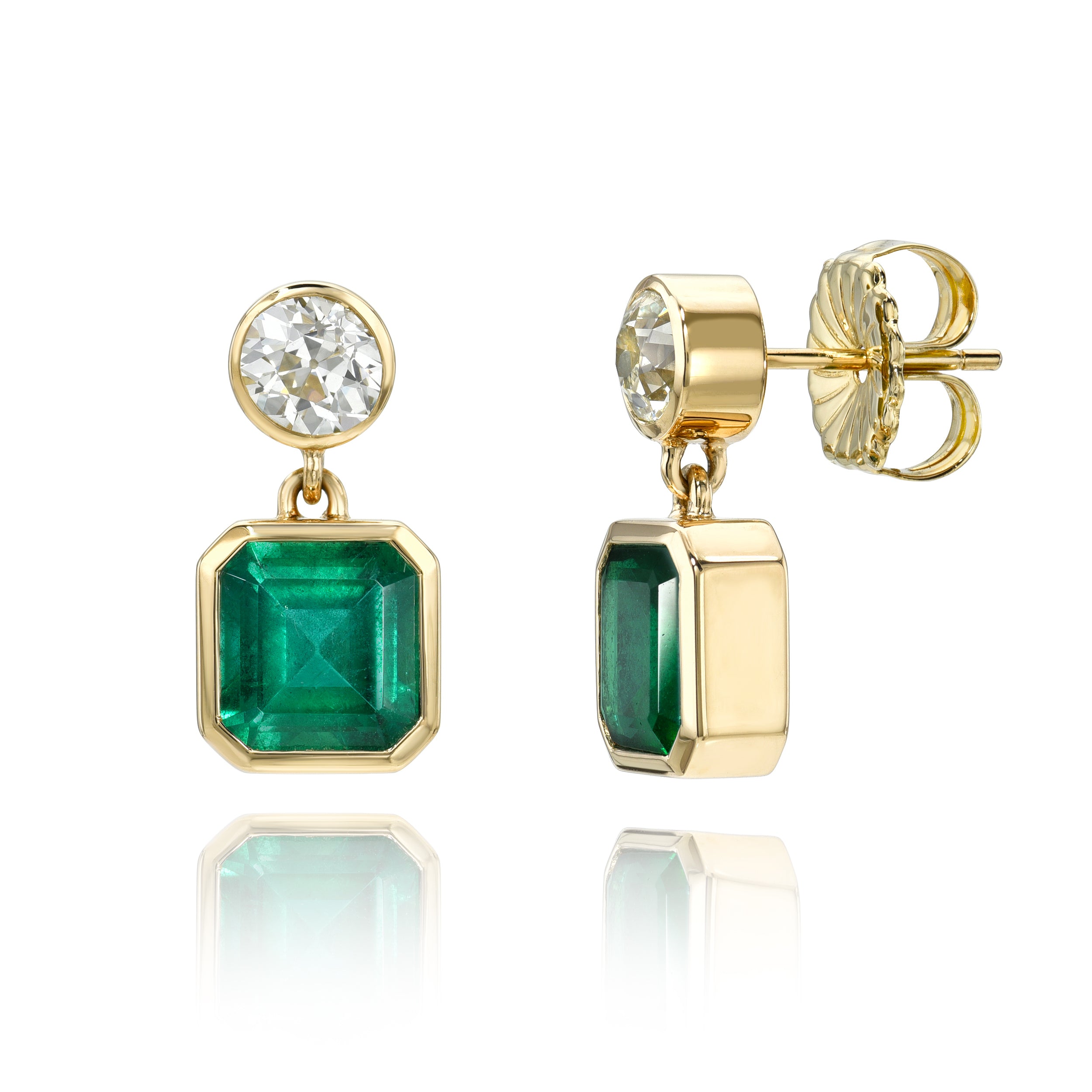 4.65ctw GIA certified emerald cut green emeralds with 1.64ctw L-O-P/VS1- I1 old European cut diamonds bezel set in handcrafted 18K yellow gold double drop earrings.