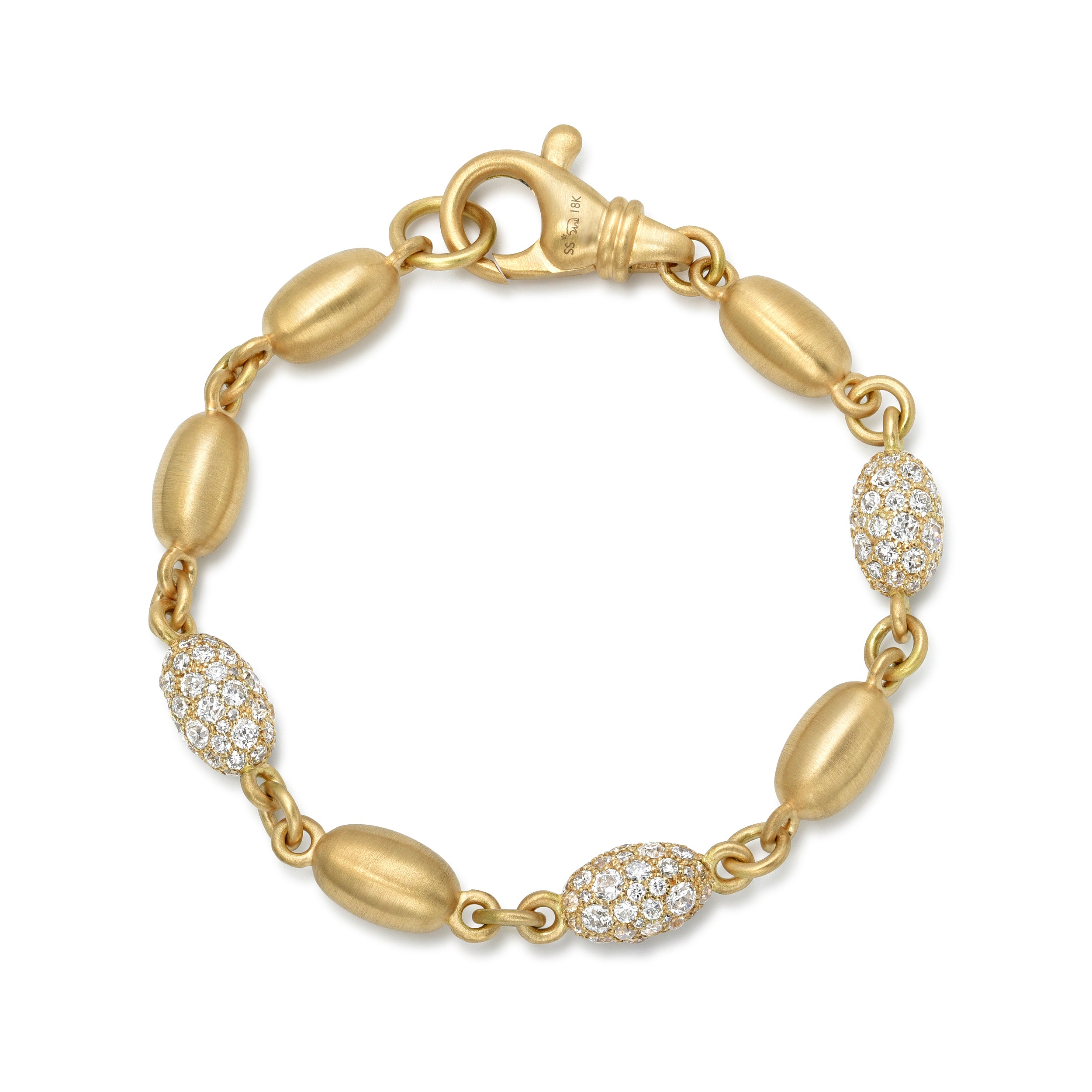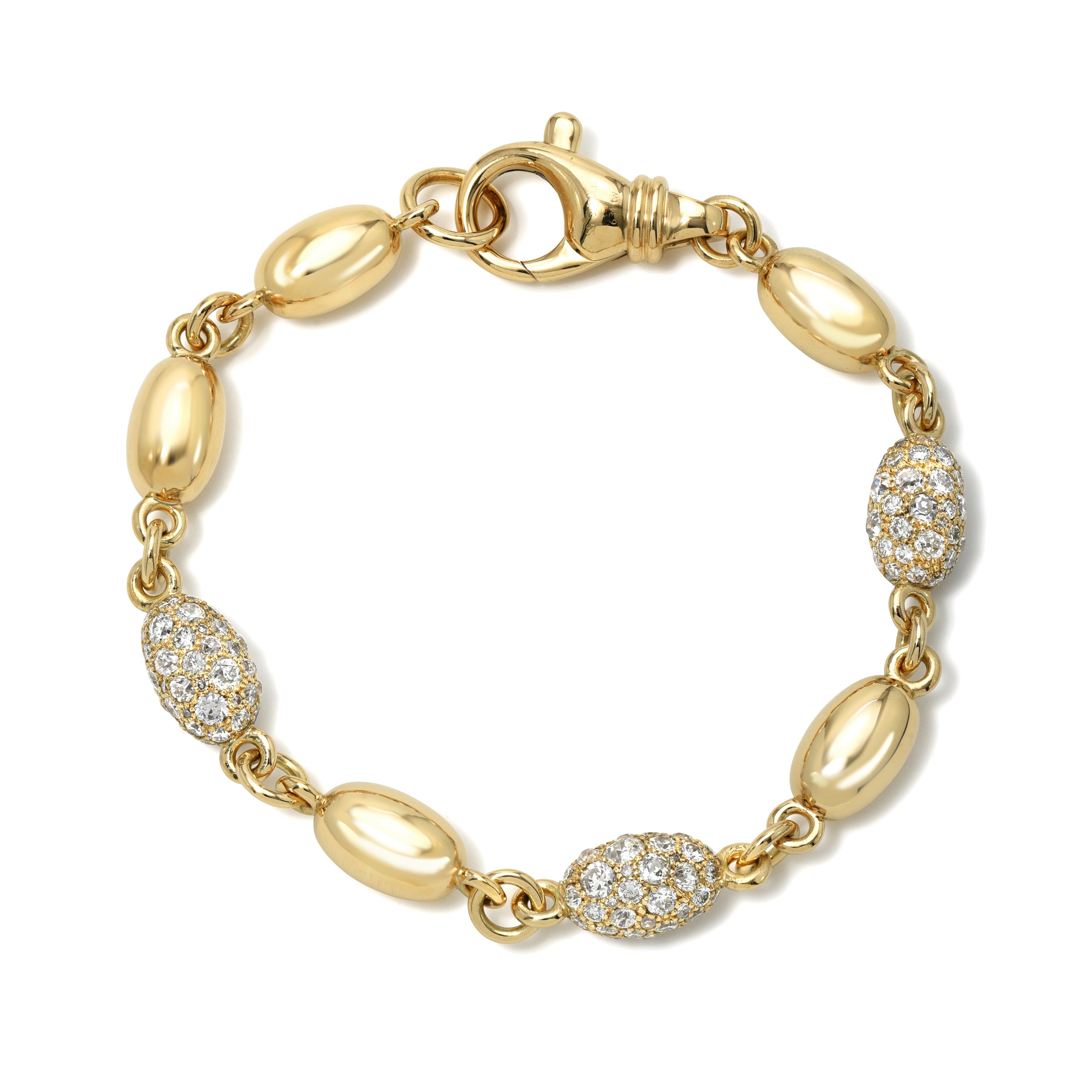 Approximately 6.20-6.30ctw varying old cut and round brilliant cut diamonds set on a handcrafted 18K yellow gold large oval bead bracelet, available in a polished or satin finish.
