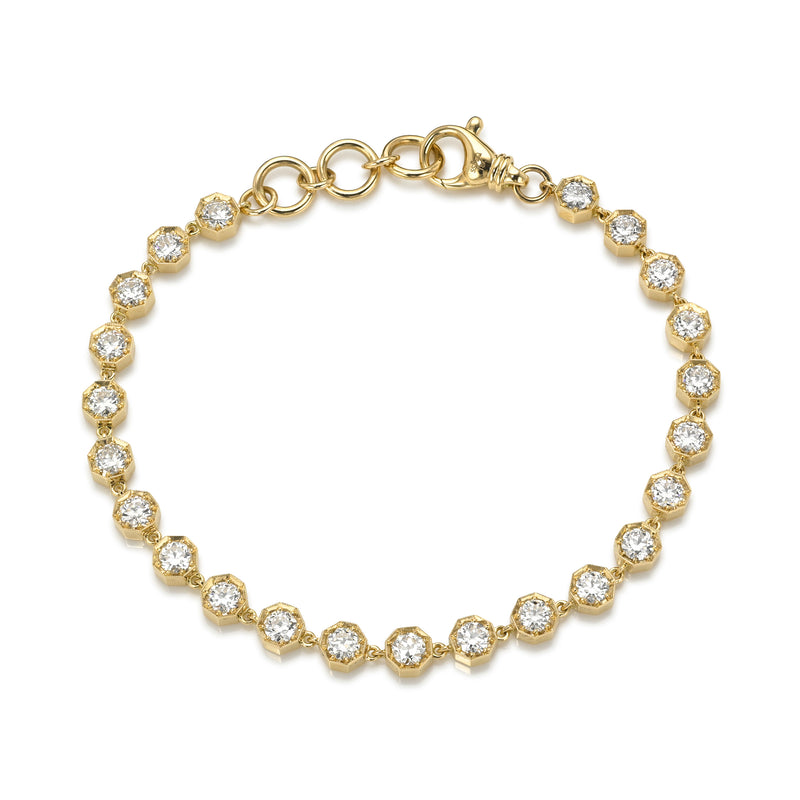 3.40ctw H-I/VS-SI old European cut diamonds set in a handcrafted 18K yellow gold diamond tennis bracelet.