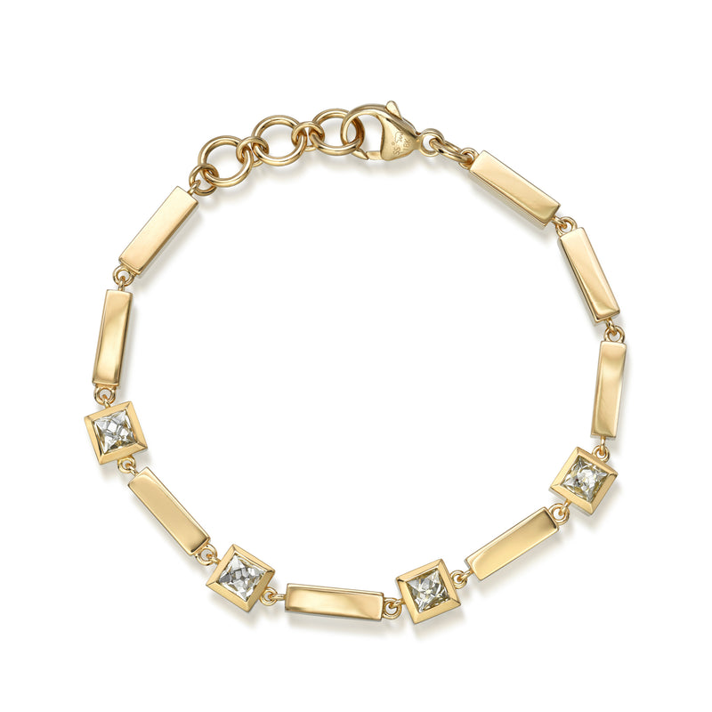 2.50ctw H-J/VS-SI French cut diamonds bezel set on a handcrafted 18K yellow gold full bar bracelet.