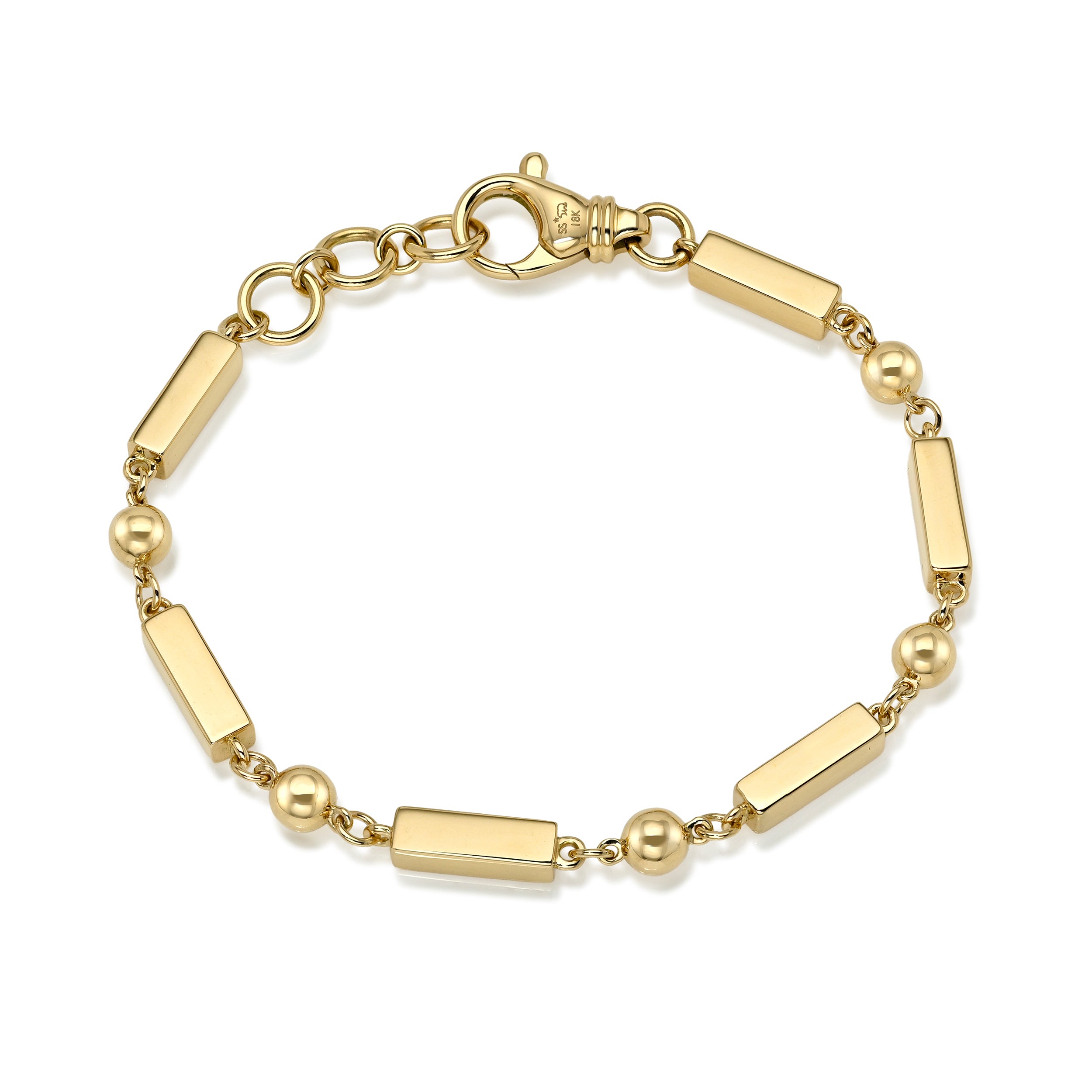 Handcrafted 18K yellow gold alternating solid rectangular link and bead bracelet.