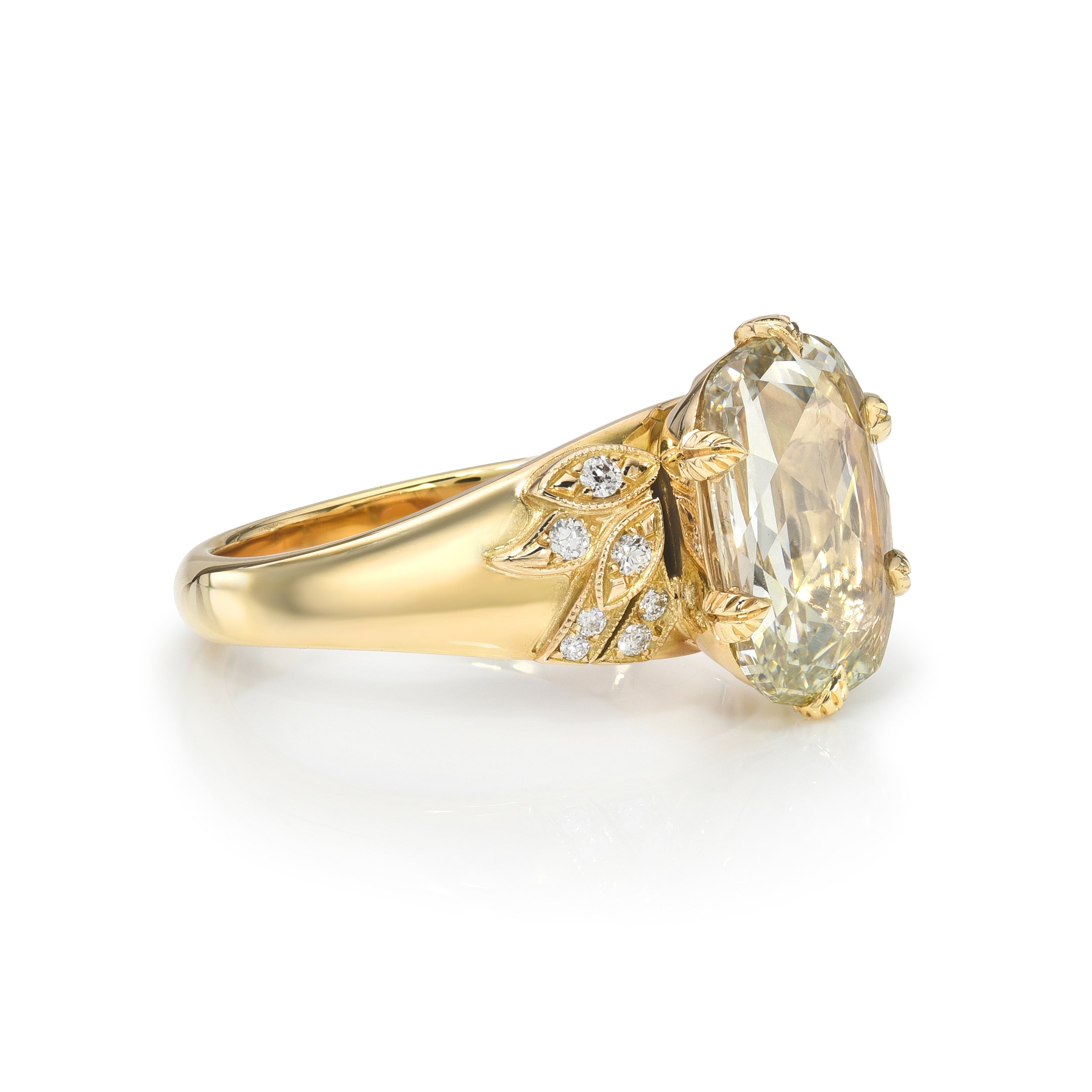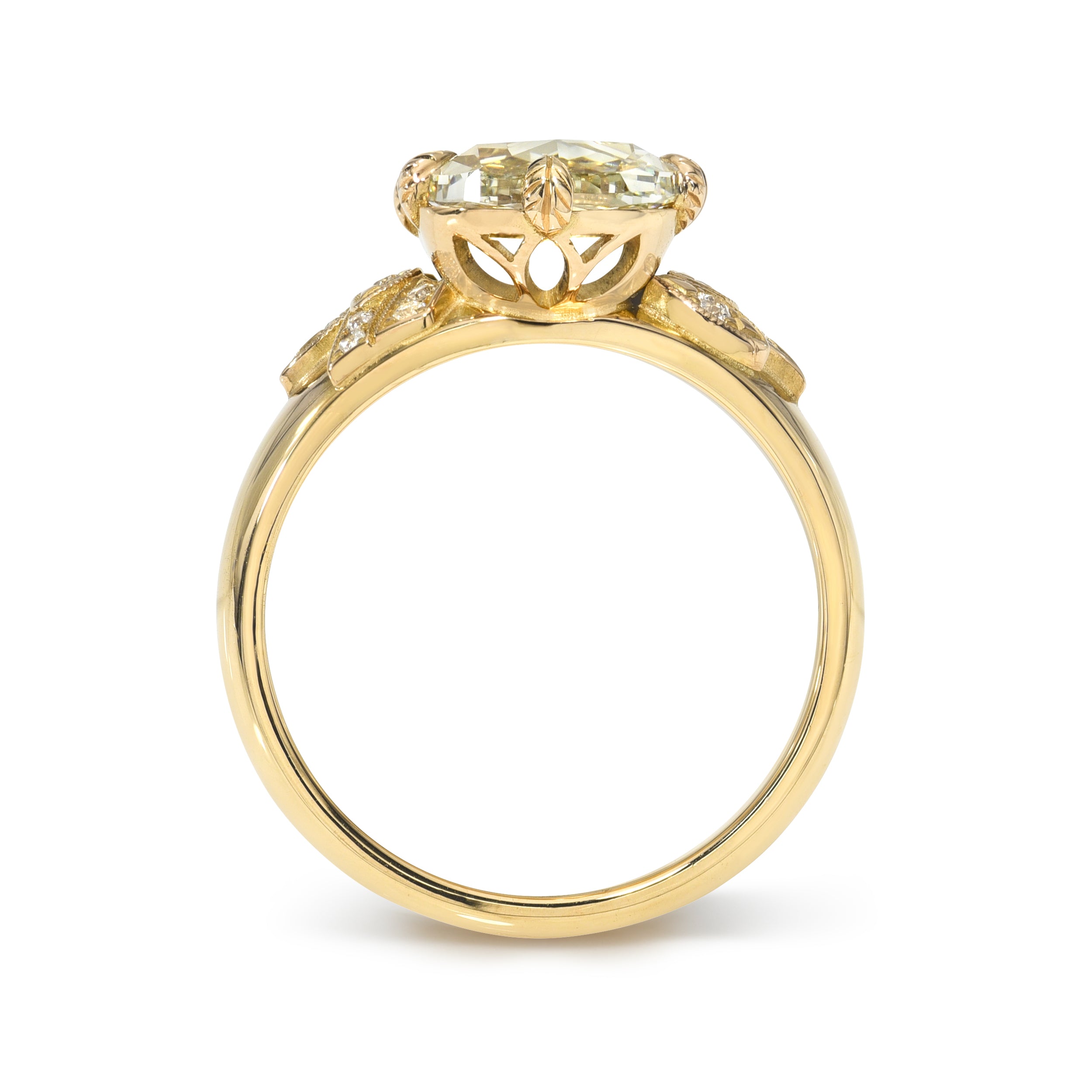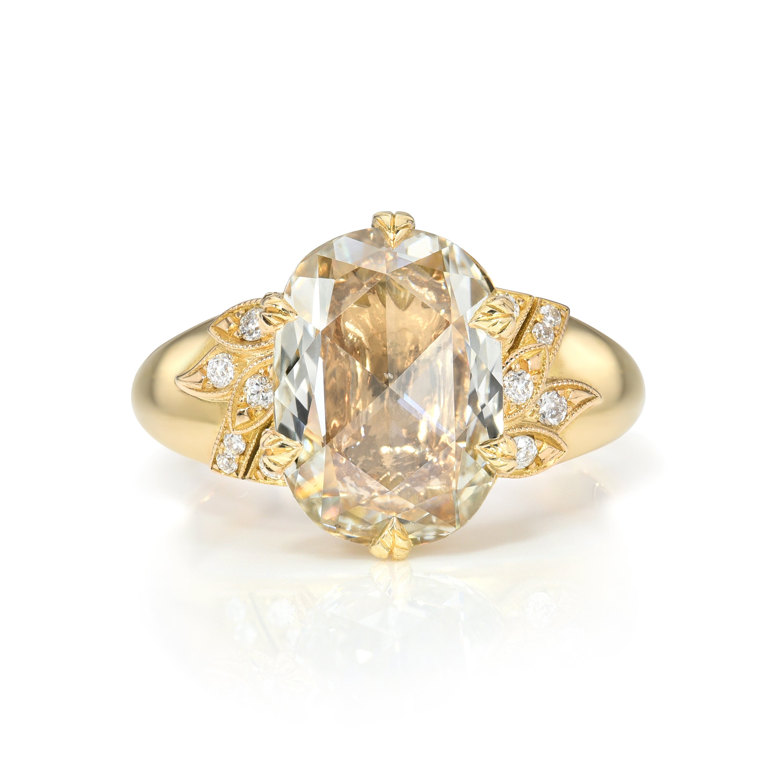 If the 4 Cs of Diamond Quality are Cut, Color, Clarity, and Carat Weight, then antique diamonds offer a 5th C: Character. With a unique play of light due to their hand-cut nature, each antique diamond is truly one-of-a-kind. The appeal of these rare diamonds lies in their broad facet patterns, their unique silhouettes, and their ability to dazzle in low and modern lighting conditions. Unlike their modern counterparts, which are cut with modern machinery and to exacting specifications, there are only a finite number of antique diamonds available, making them scarce and highly sought after. Repurposing antique diamonds also reduces environmental impact, which is something we feel very strongly about.