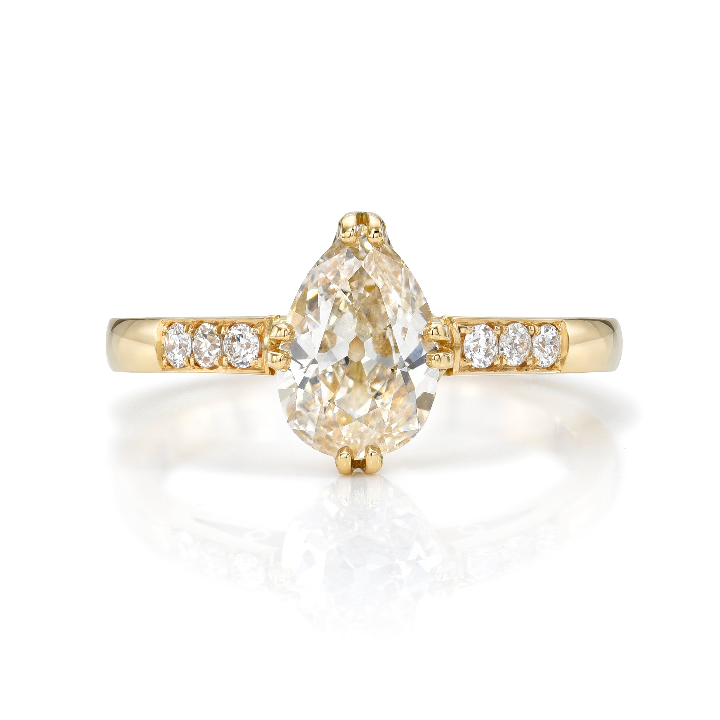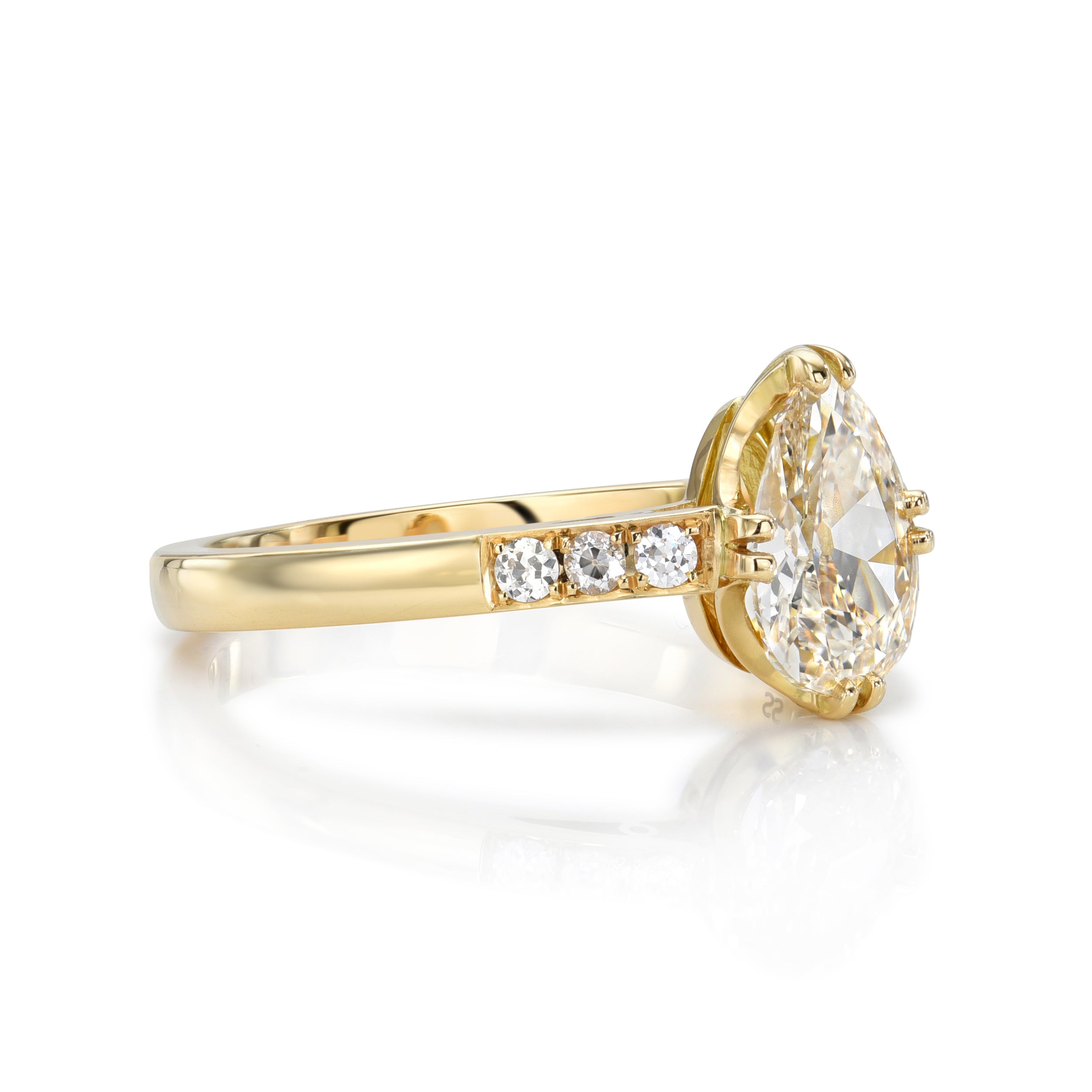 1.01ct L/VS2 GIA certified pear shaped diamond with 0.06ctw old European cut accent diamonds prong set in a handcrafted 18K yellow gold mounting.