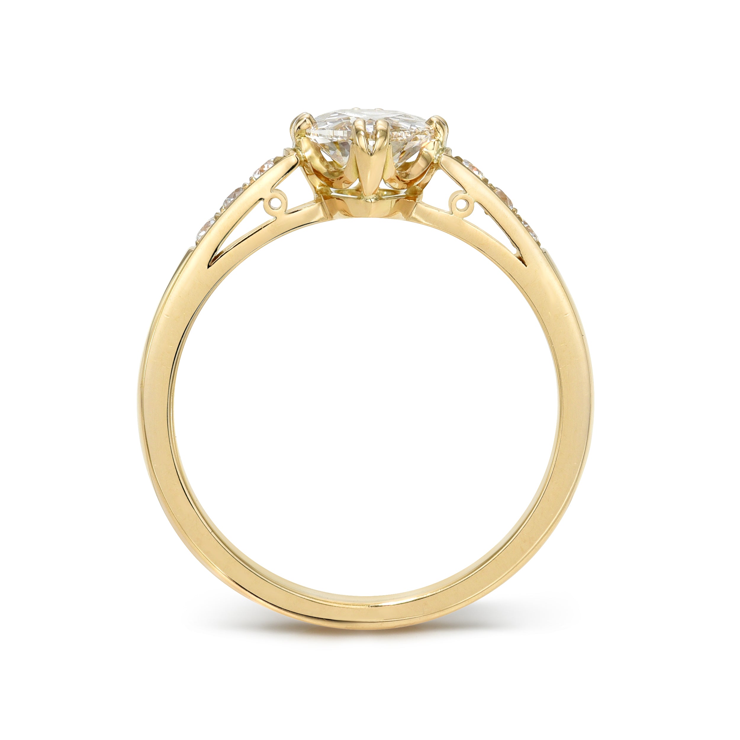 Antique oval, marquise, and pear-shaped diamonds are not too dissimilar to their modern counterparts, but what makes them unique is their broad facet patterns and open culets. Additionally, antique pear shape diamonds and marquise (or movals) have a softness to their shape where the diamond does not come to a perfect point – a direct result of the hand-cutting techniques of the 19th century.