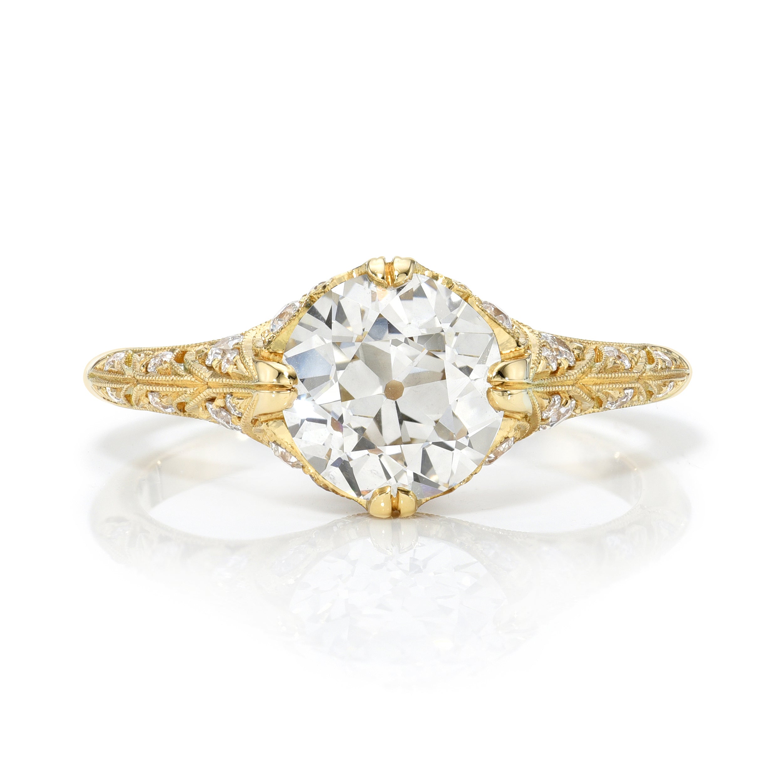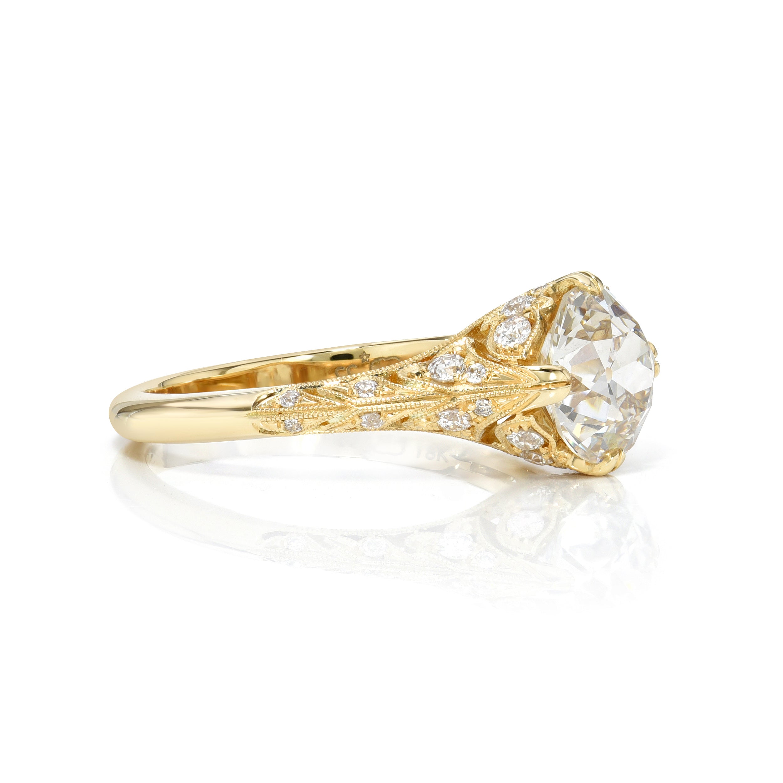 1.43ct L-Faint Brown/VS1 GIA certified old European cut diamond with 0.22ctw old European cut accent diamonds prong set in a handcrafted 18K yellow gold mounting.