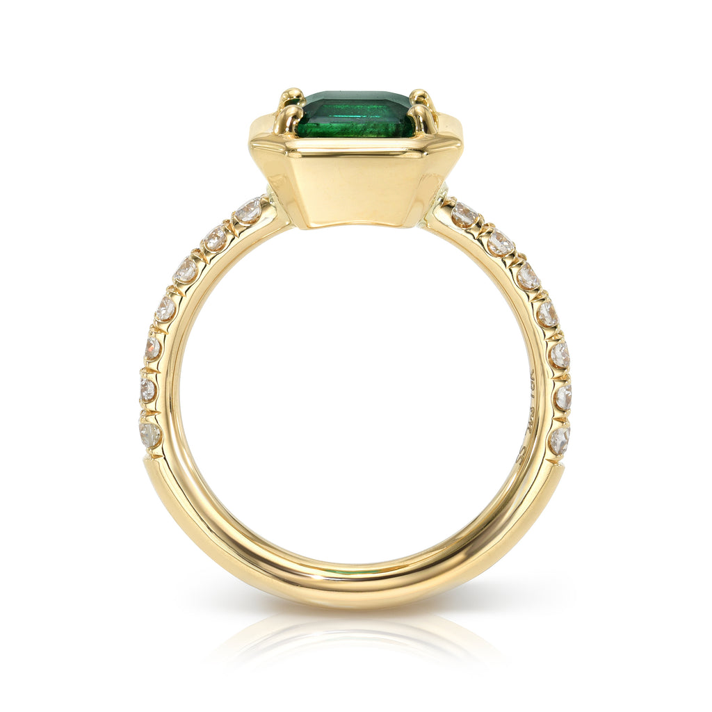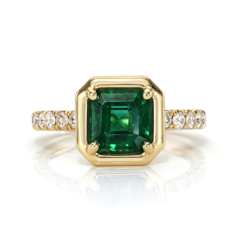 1.69ct GIA certified Zambian Asscher cut green emerald with 0.40ctw old European cut accent diamonds prong set in a handcrafted 18K yellow gold mounting.