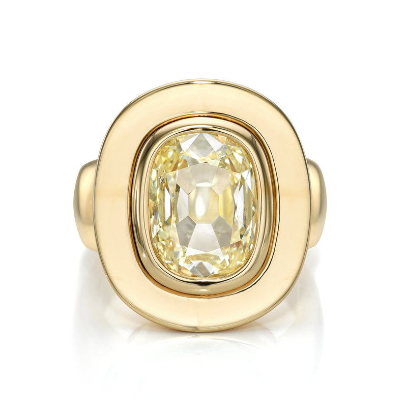 3.10ct U-V/SI1 GIA certified antique cushion cut diamond bezel set in a handcrafted 18K yellow gold mounting.
