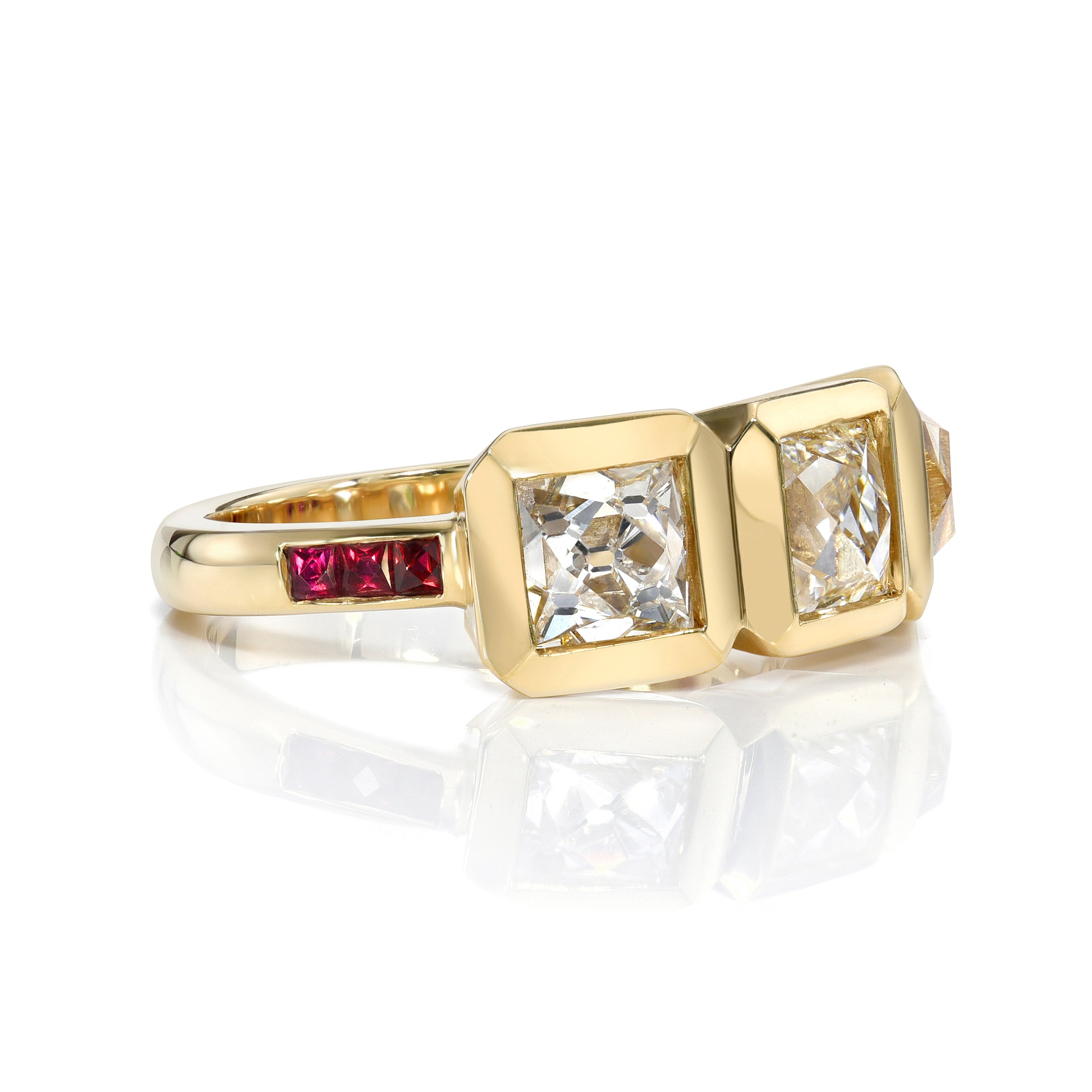 2.93ctw F-H/VS1-VS2-I1 GIA certified French cut diamonds with 0.24ctw square French cut rubies bezel set in a handcrafted 18K yellow gold mounting.