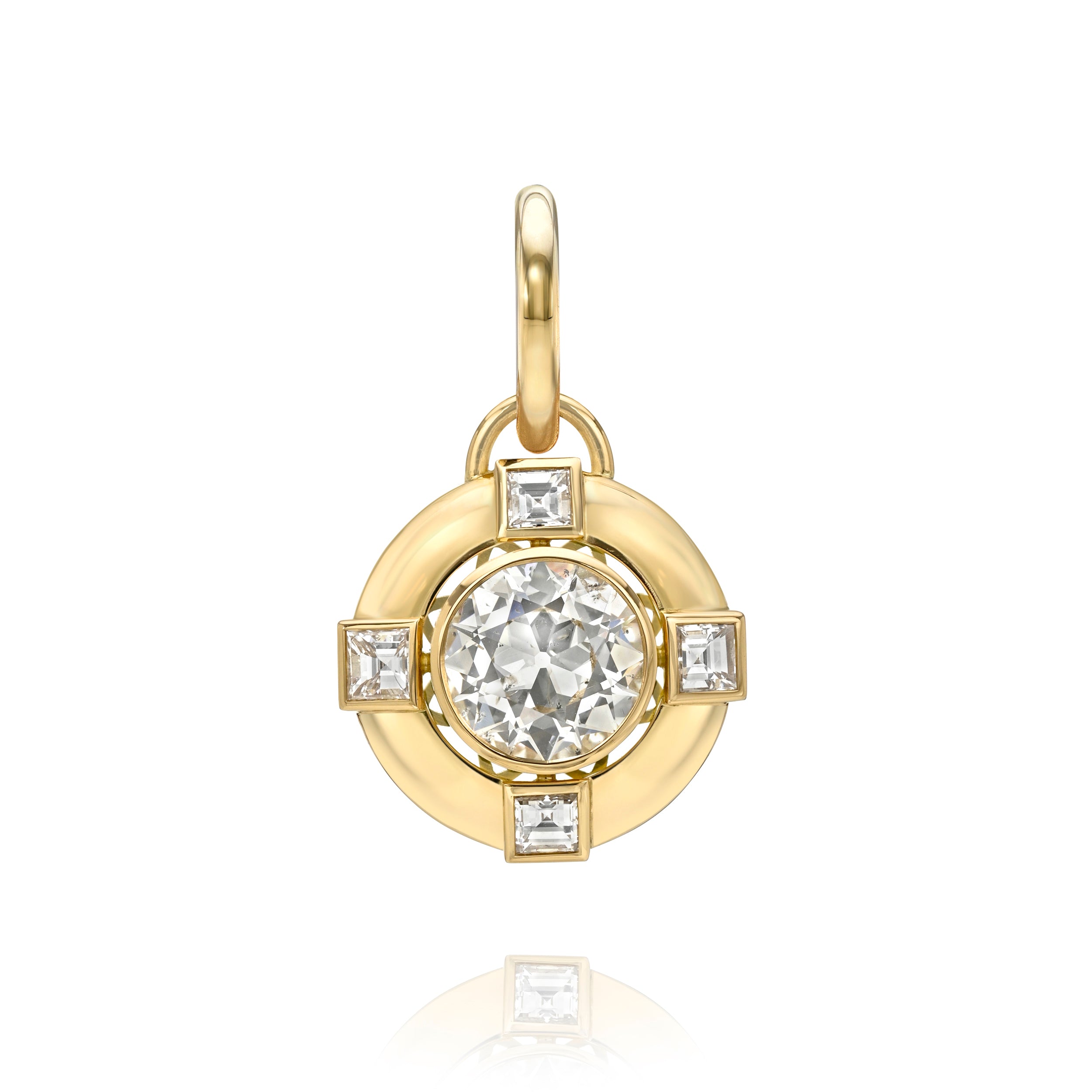 2.05ct J/I2 GIA certified old European cut diamond with 0.72ctw carré cut accent diamonds bezel set in a handcrafted 18K yellow gold pendant.