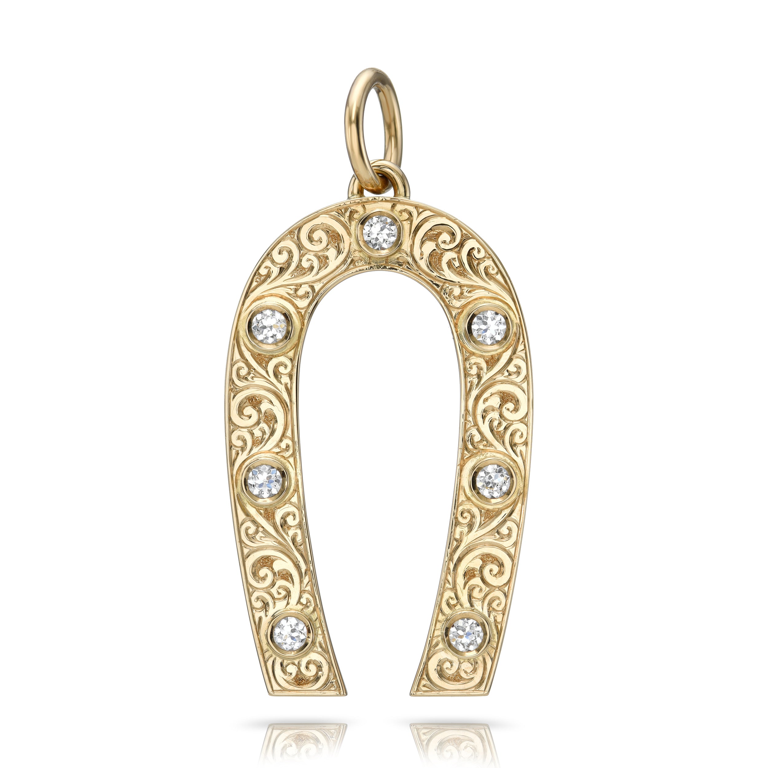 Approximately 0.70ctw G-H/VS old European cut diamonds bezel set in a handcrafted, hand engraved 18K yellow gold horseshoe pendant.