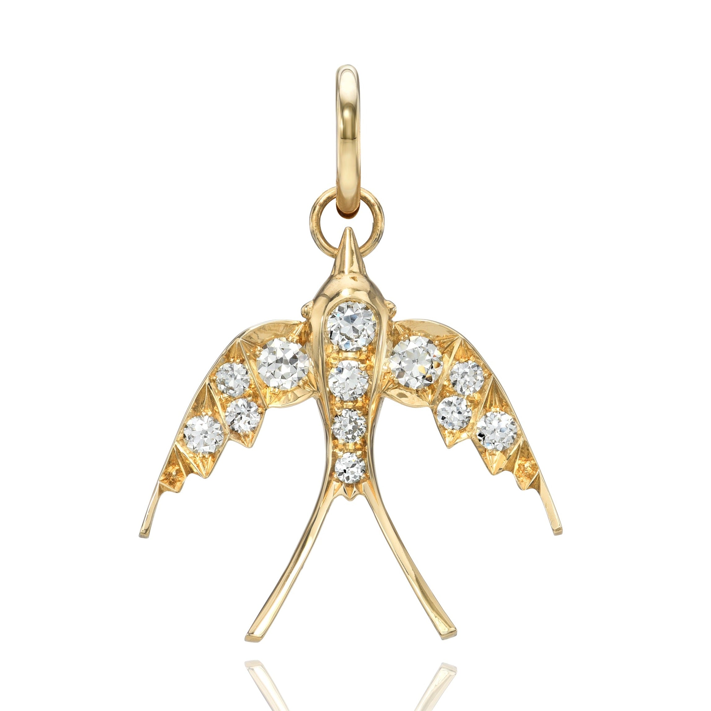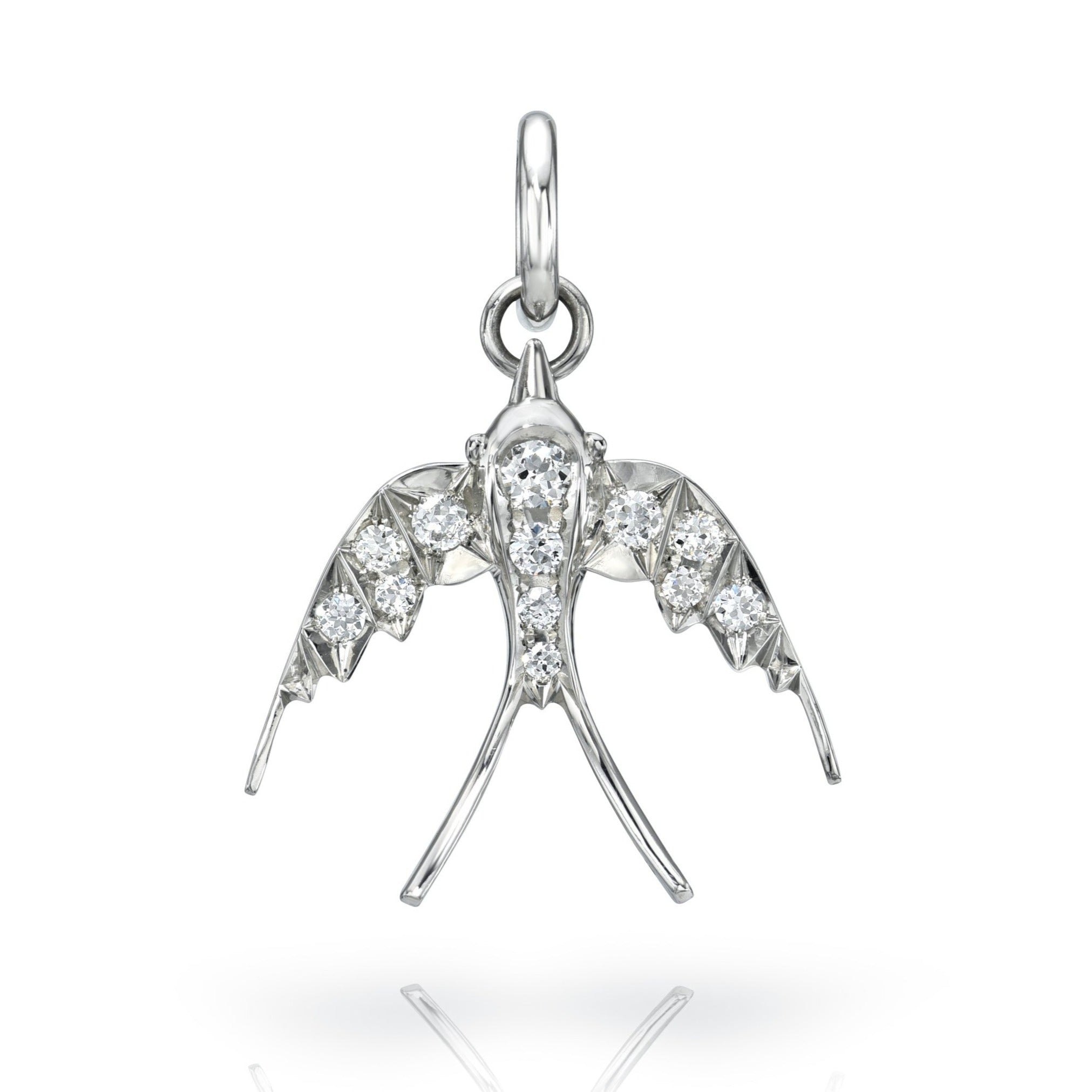 Approximately 0.70ctw G-H/VS old European cut diamonds set in a handcrafted swallow pendant. Available in an oxidized or polished finish.