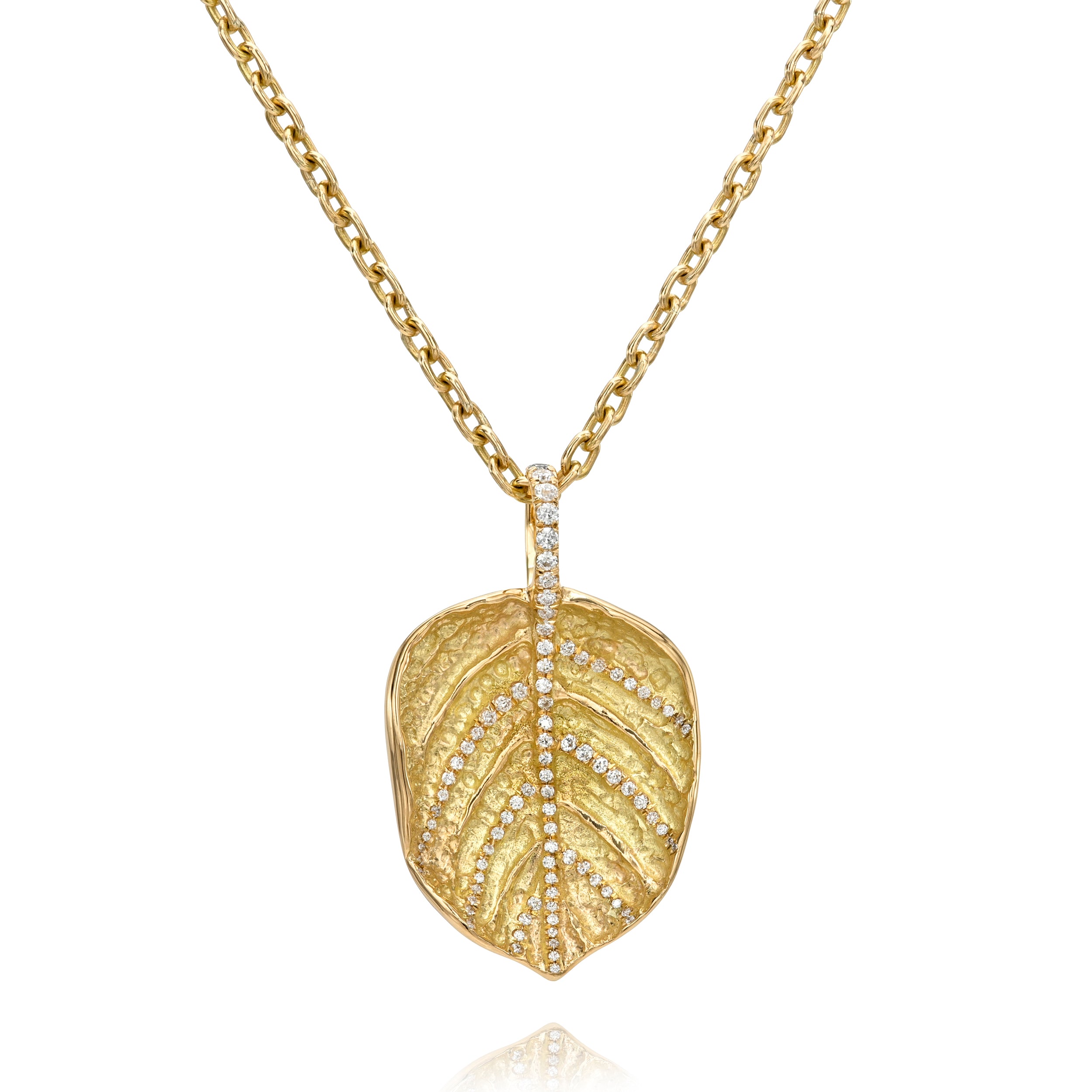 Handcrafted 18K yellow gold leaf pendant featuring approximately 0.55ctw old European cut diamonds. Also shown here on our Kai chain.