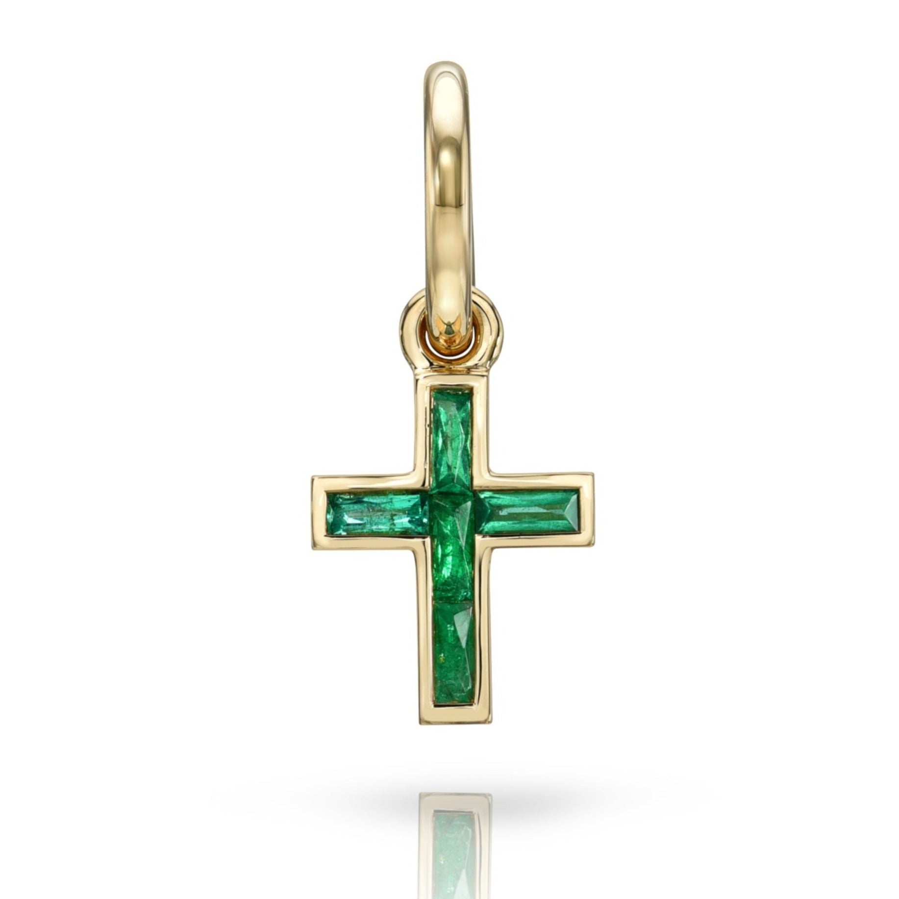 Approximately 0.30ctw French cut gemstones set in a handcrafted 18K yellow gold cross. Cross measures 8.20mm x 9.80mm.