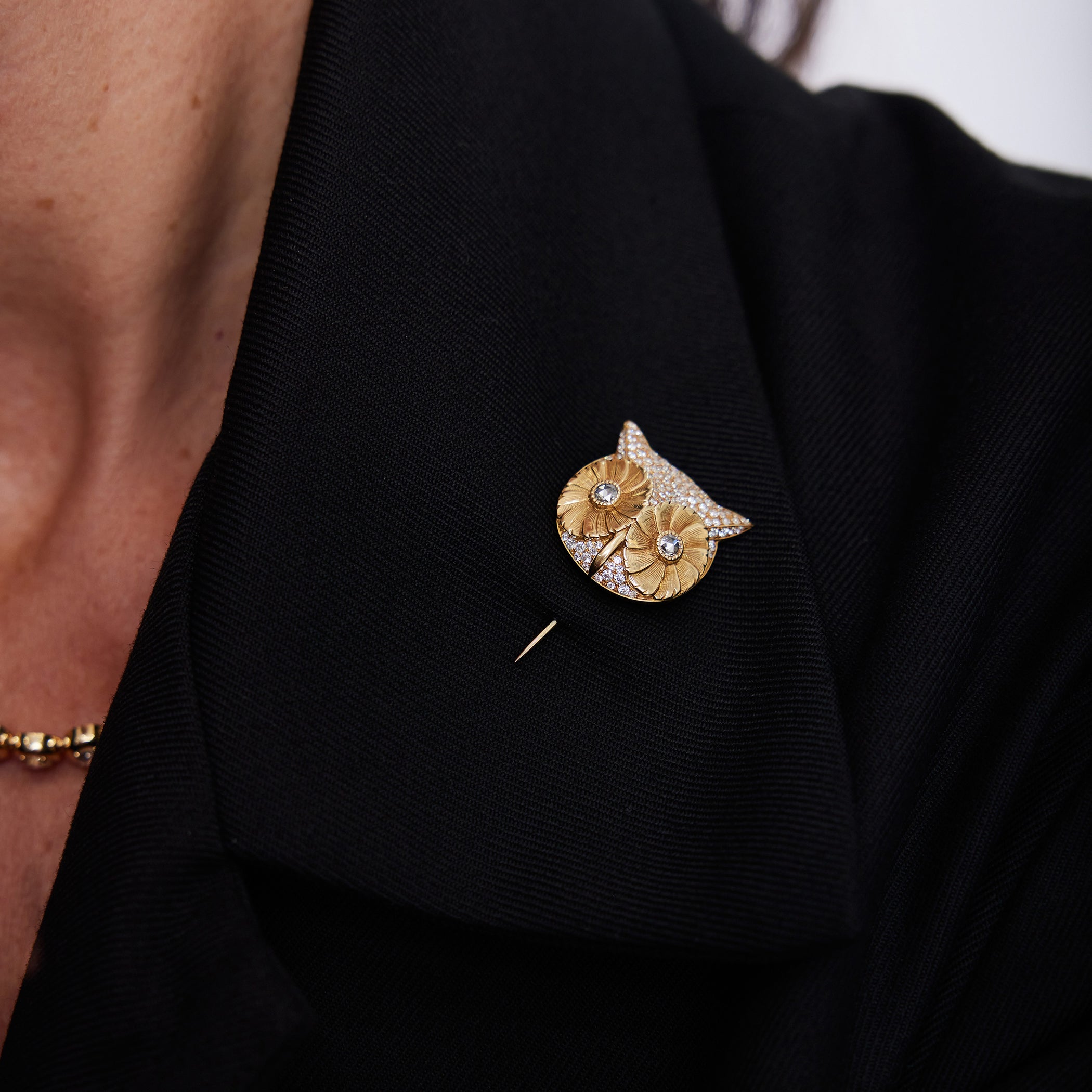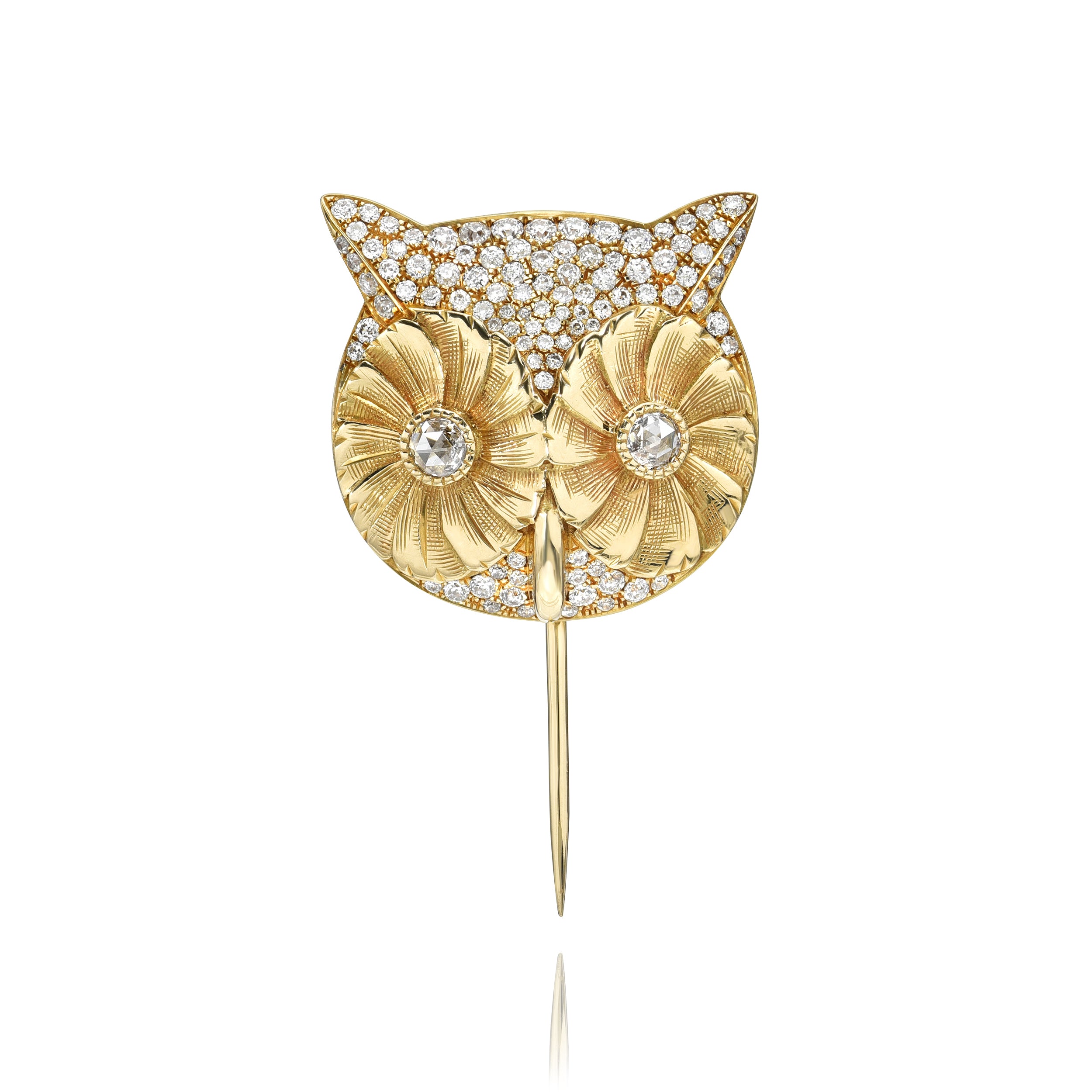 Approximately 0.10ctw rose cut diamonds with 0.70ctw old European cut accent diamonds pavé set in a handcrafted 18K yellow gold owl stick pin.