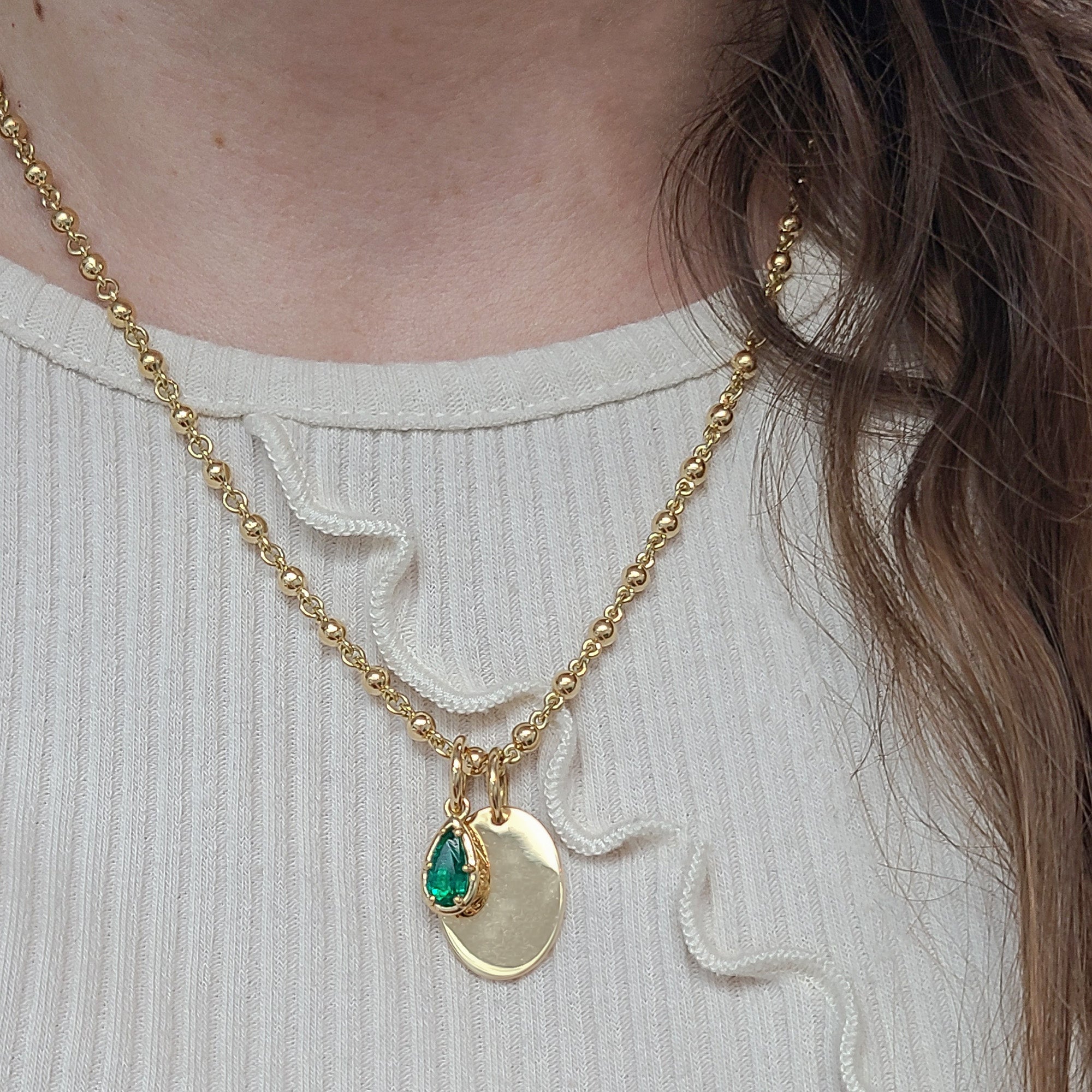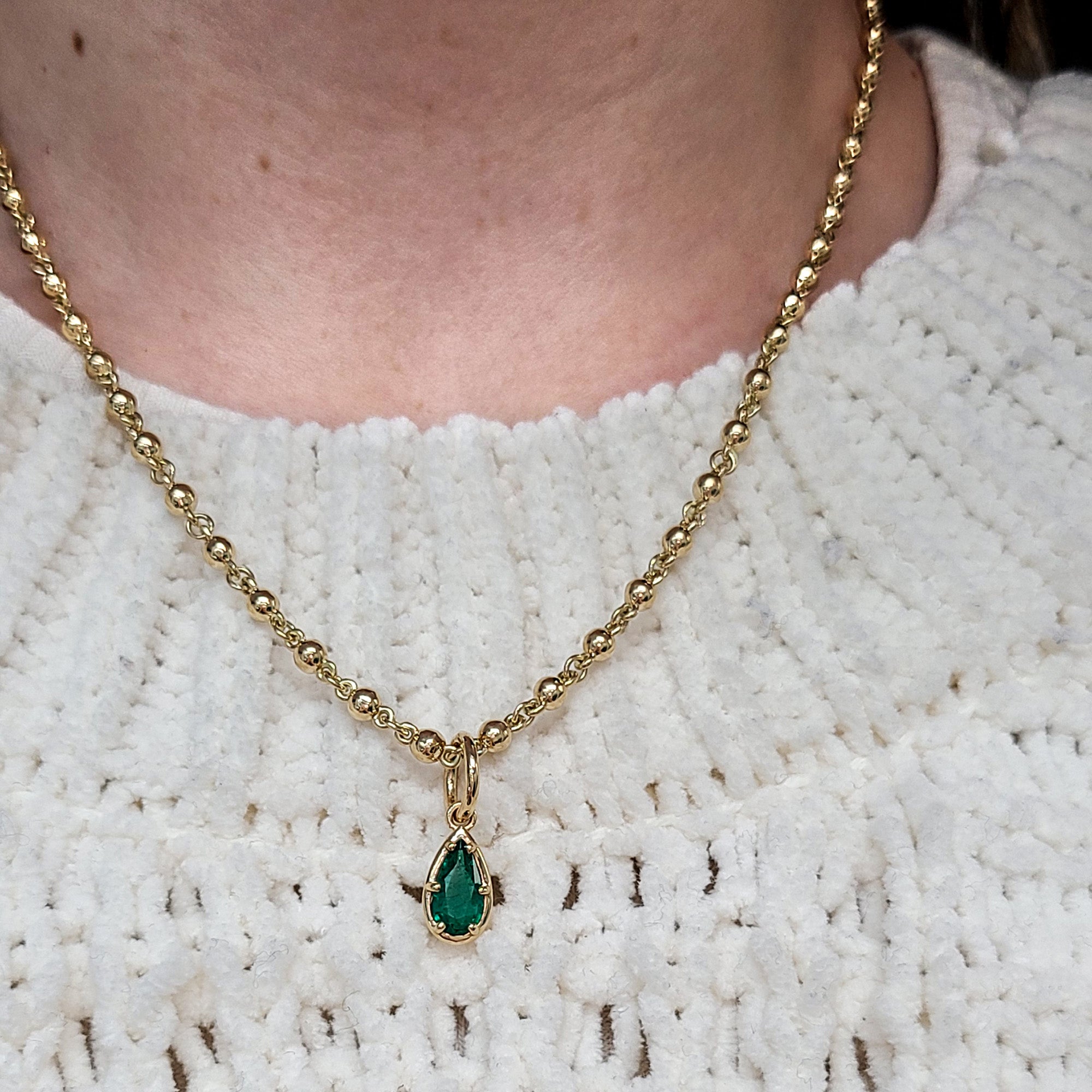 0.76ct pear shape green emerald prong set in a handcrafted, hand engraved 18K yellow gold drop pendant.