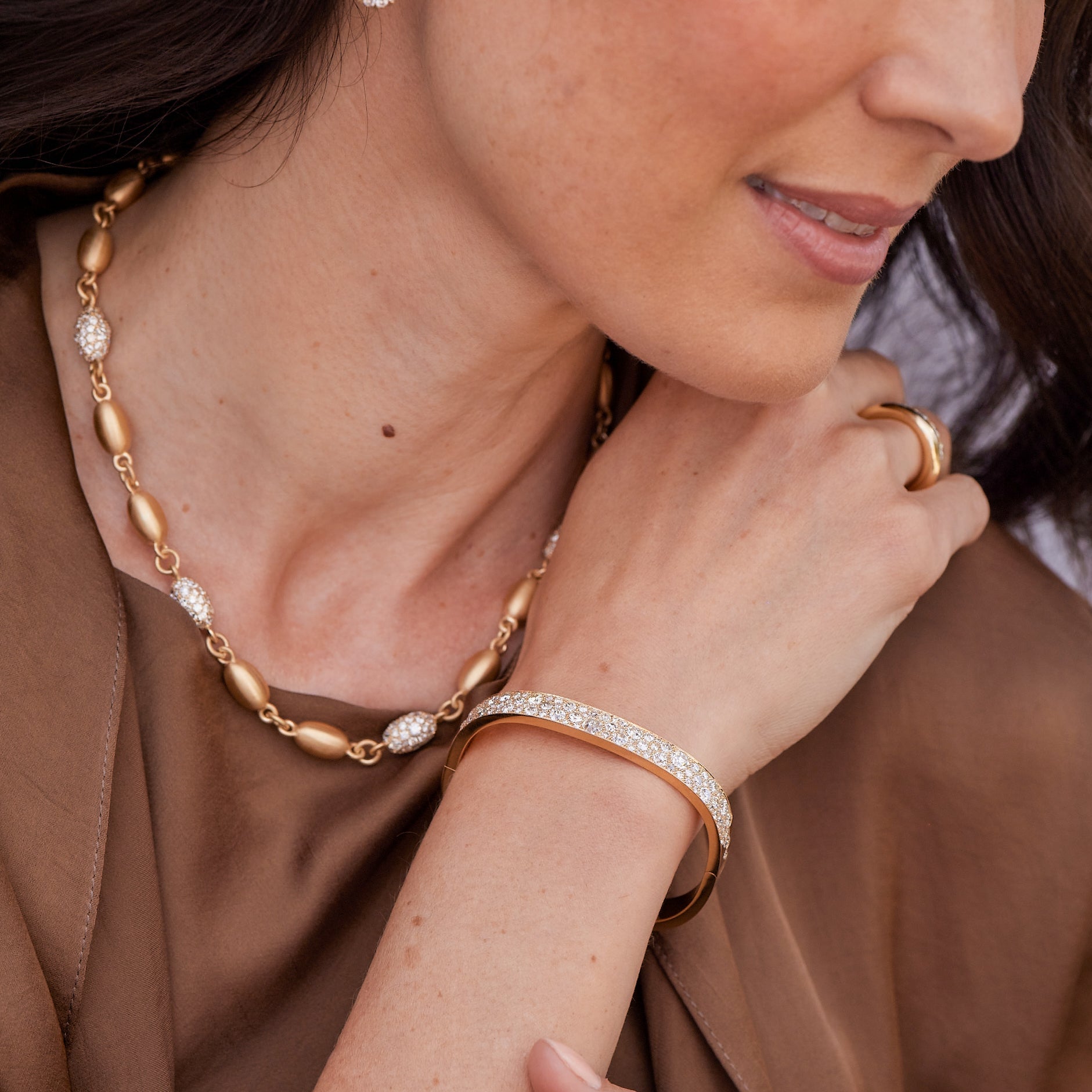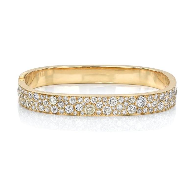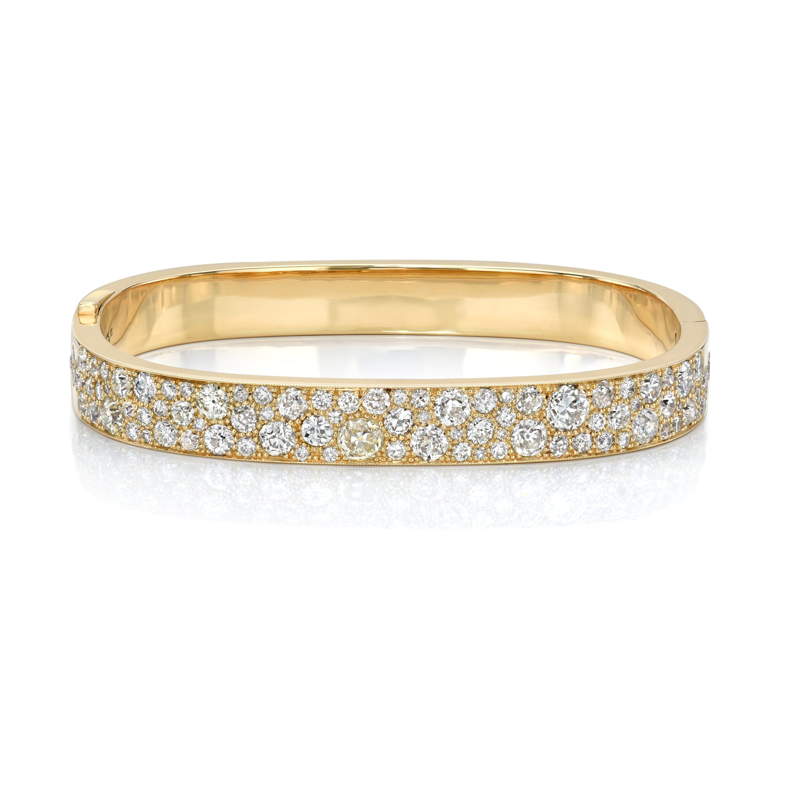 Approximately 5.90ctw various old cut and round brilliant cut diamonds cobblestone set in a handcrafted 18K yellow gold bangle bracelet.