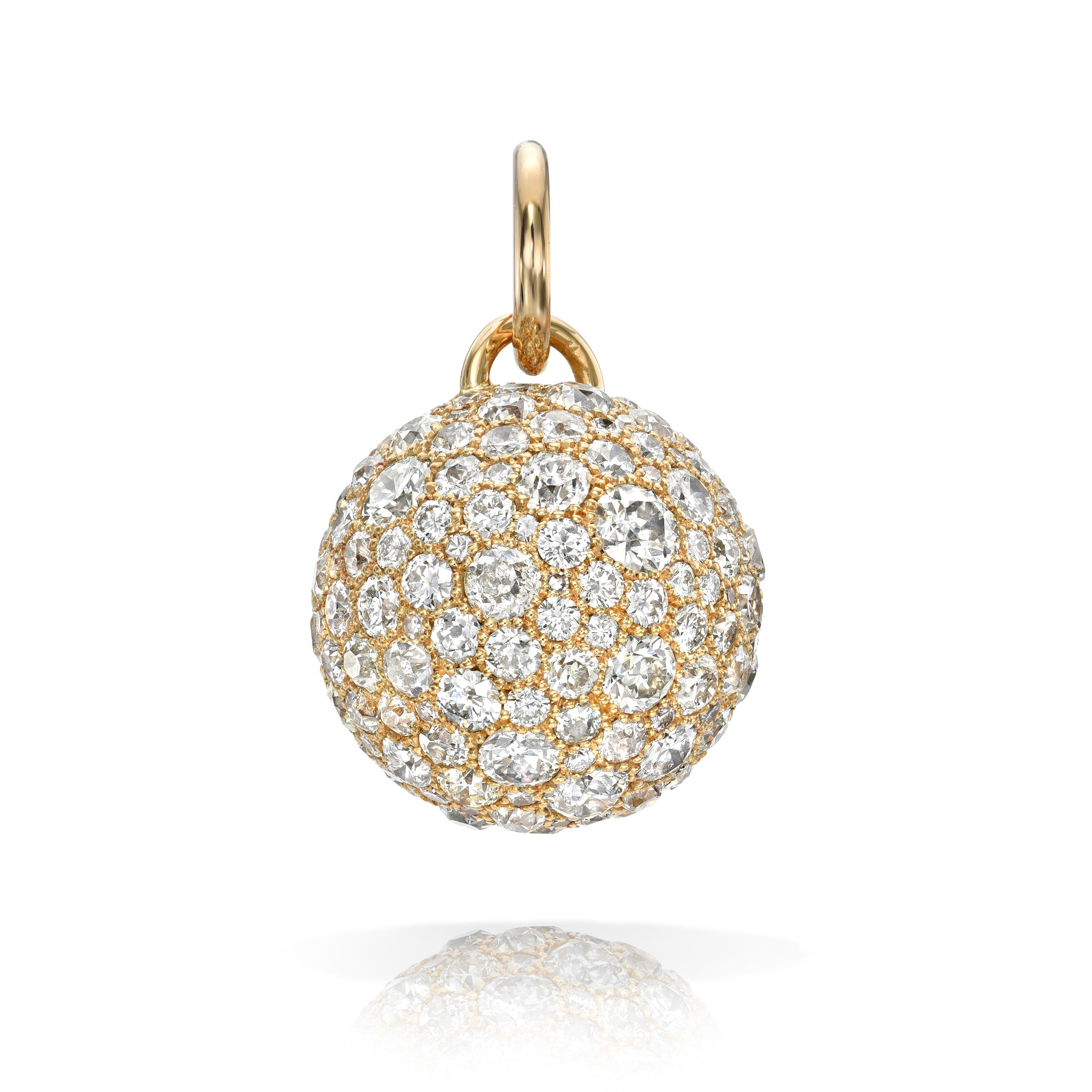 12.16ctw varying old cut and round brilliant cut diamonds set in a handcrafted sphere-shaped 18K yellow gold pendant.
