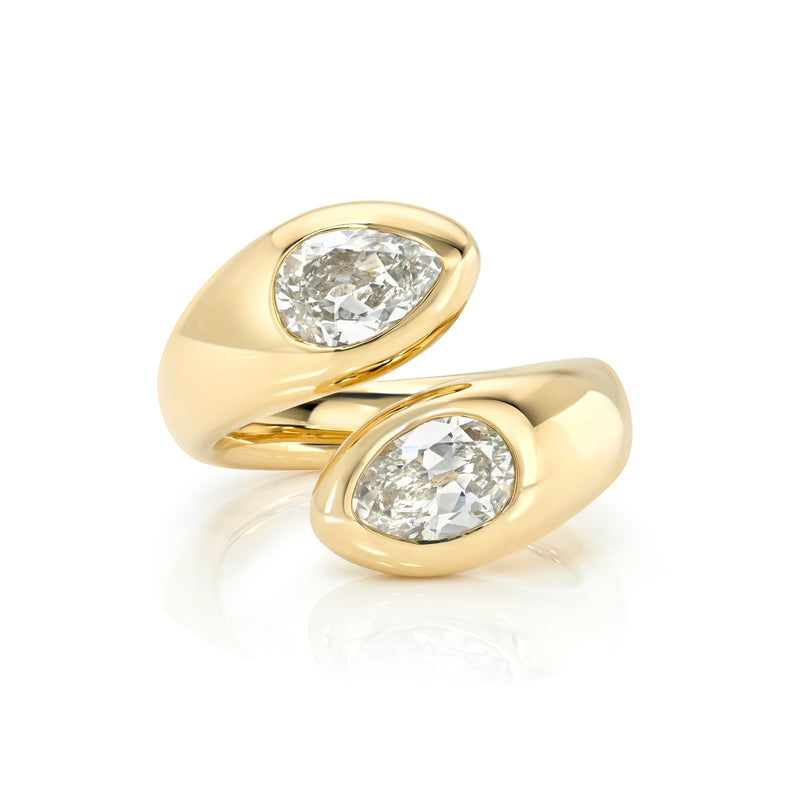 2.27ctw J-K/VVS2 GIA certified pear shaped diamonds flush set in a handcrafted 18K yellow gold bypass ring.