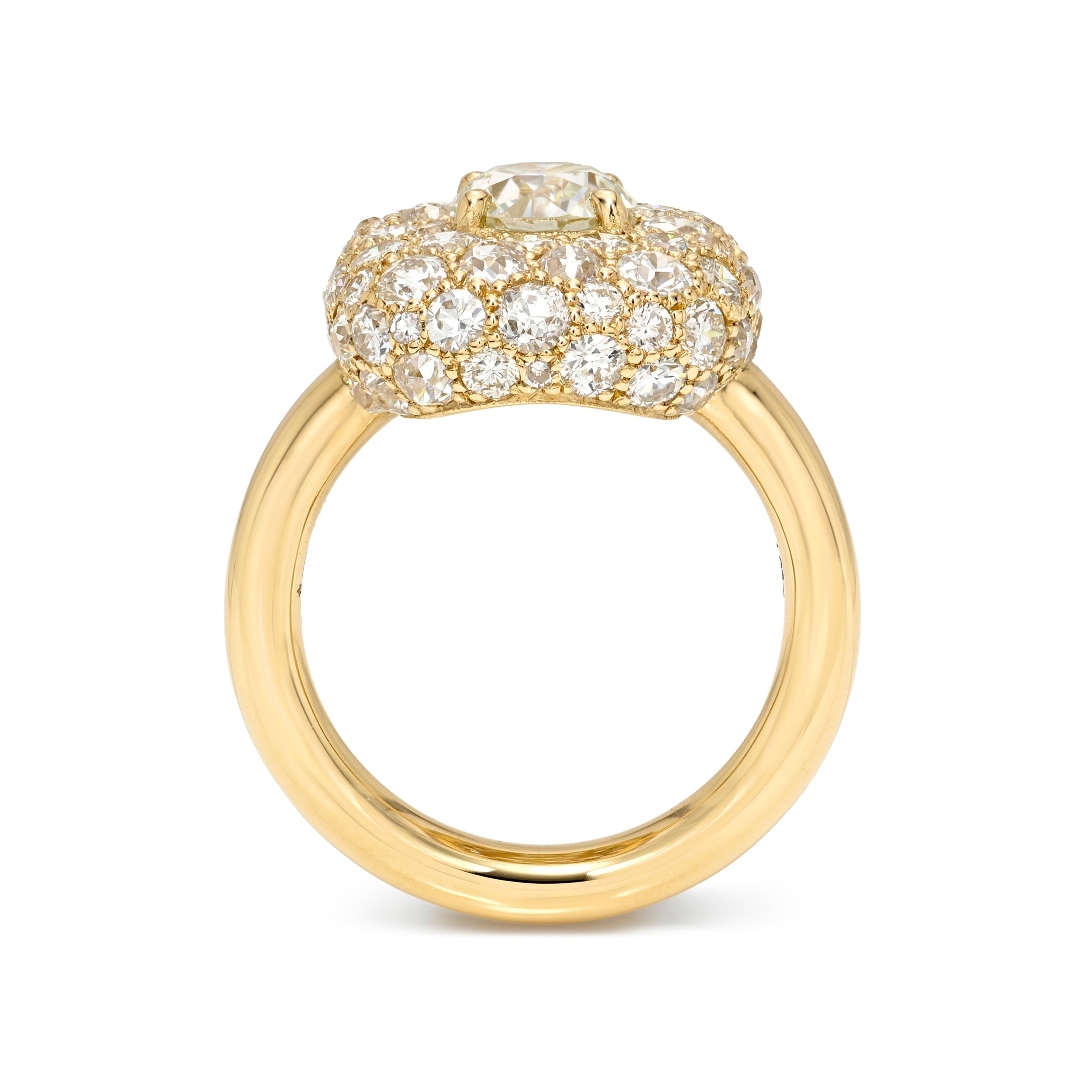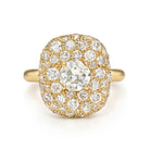 1.02ct J/SI1 GIA certified old European cut diamond prong set and surrounded by 2.93ctw various old cut and round brilliant cut cobblestone set diamonds in a handcrafted 18K yellow gold mounting.