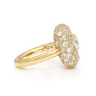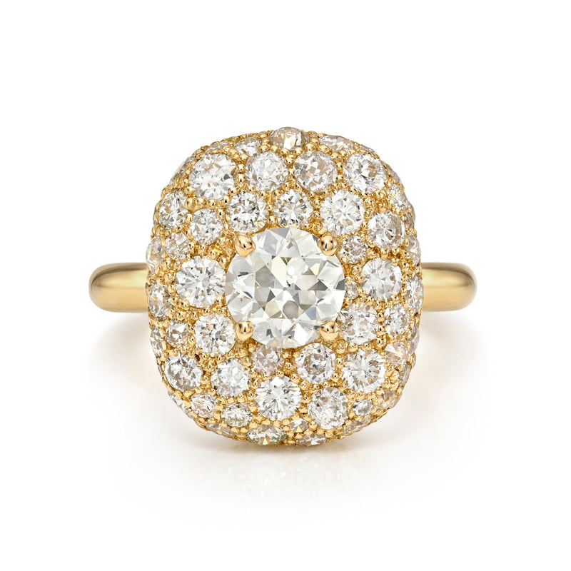 The 19th century brought about techniques that advanced the diamond cutting industry and thus, the old European cut diamond was born. With 58 facets, a small table, high crown angle, circular shape, and open culet, the old European cut diamond became the precursor to the modern round diamonds that we see today. Our vintage old European cut diamonds, cut primarily in the 1920s and 1930s, are used in many of our designs, from larger center stones to small, pave set diamonds.