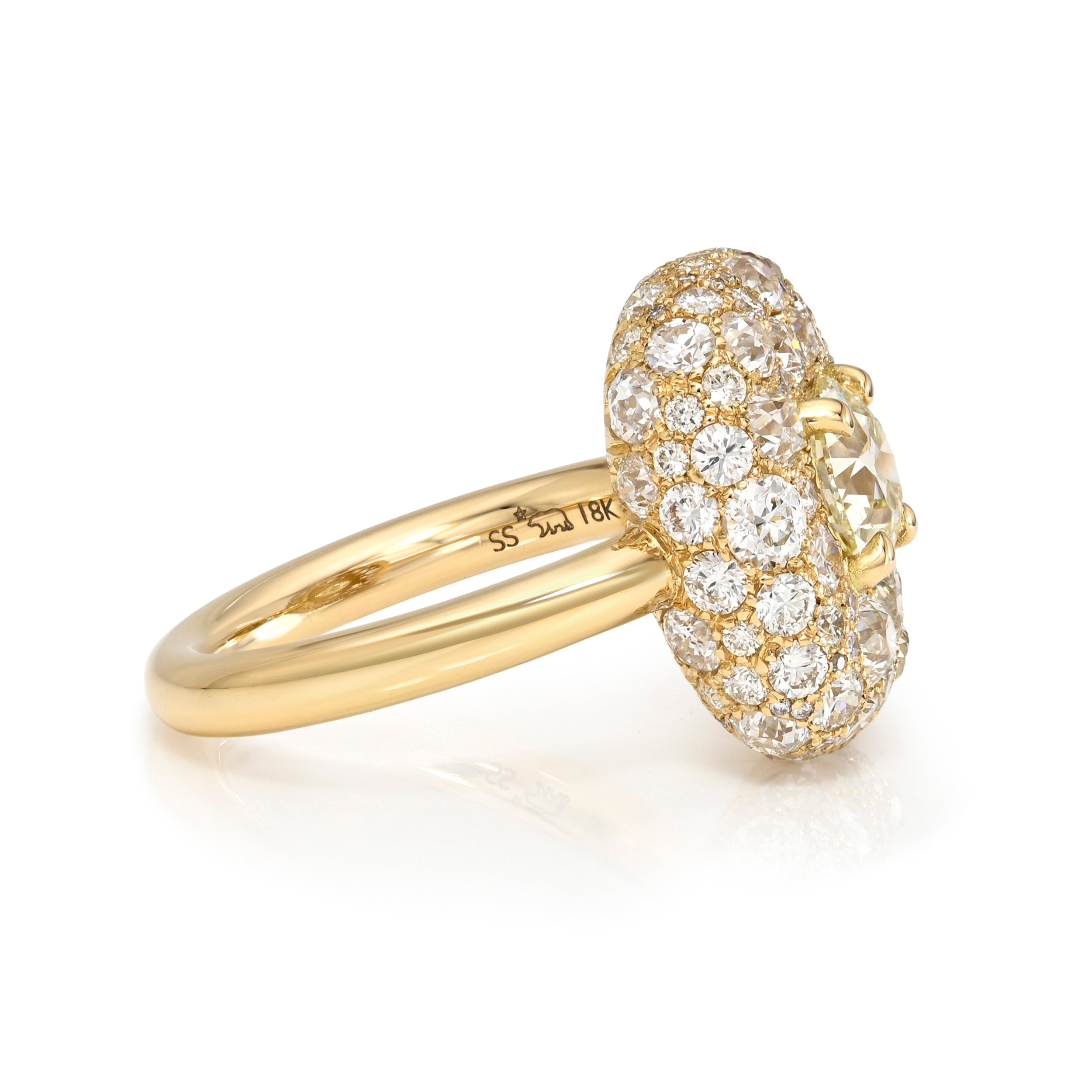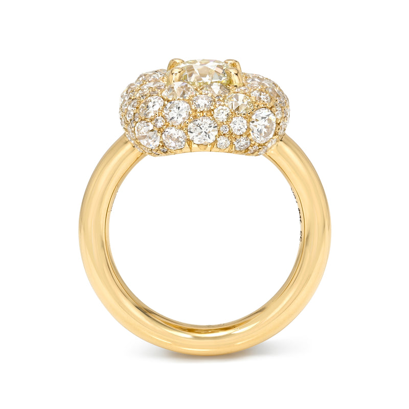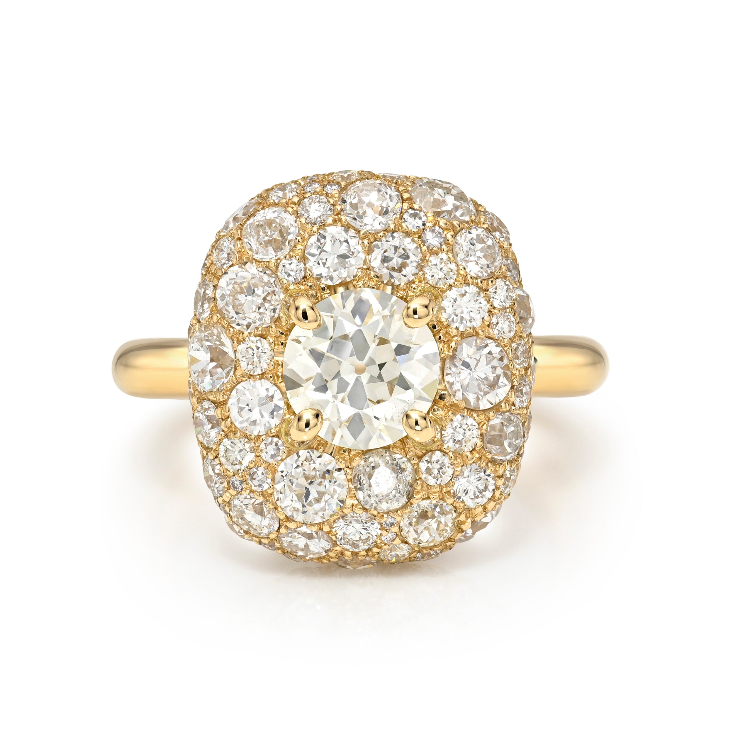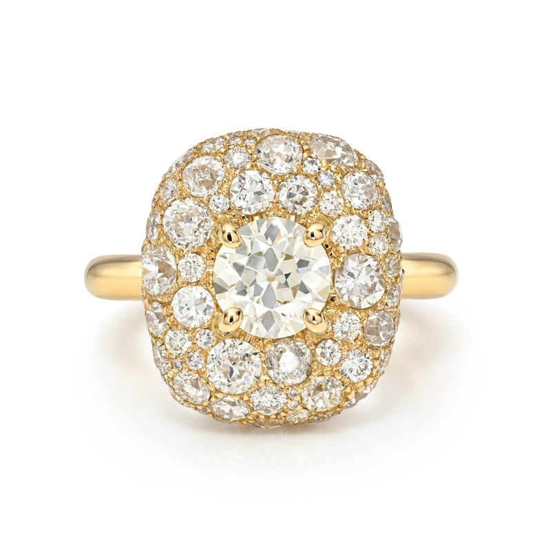 1.22ct M/VS2 GIA certified old European cut diamond prong set amongst 3.12ctw cobblestone set various old and round brilliant cut accent diamonds in a handcrafted 18K yellow gold mounting.
