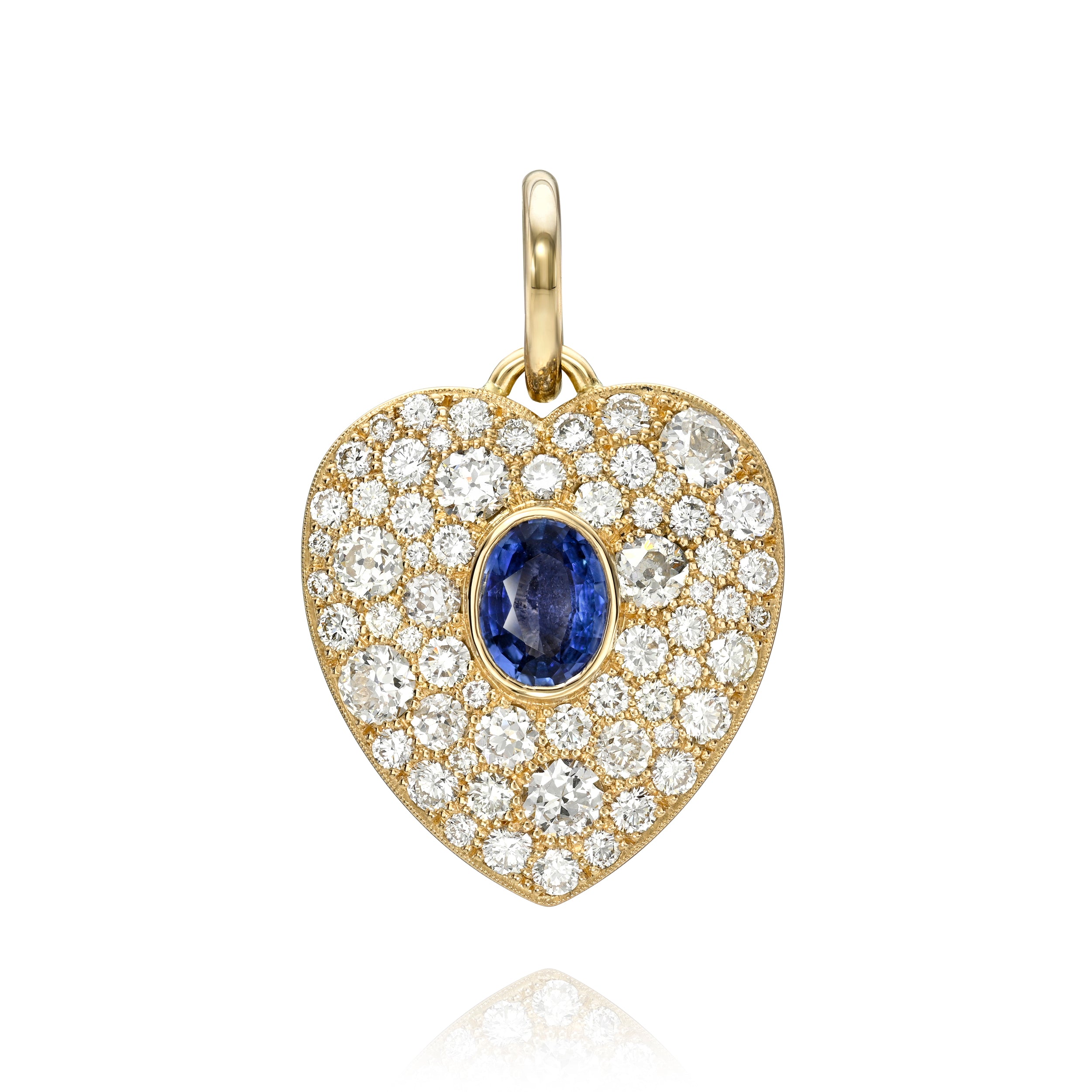 1.22ct GIA certified Sri Lankan oval cut blue sapphire, bezel set surrounded by 3.27ctw varying old cut and round brilliant cut diamonds set in a handcrafted 18K yellow gold heart-shaped pendant.
