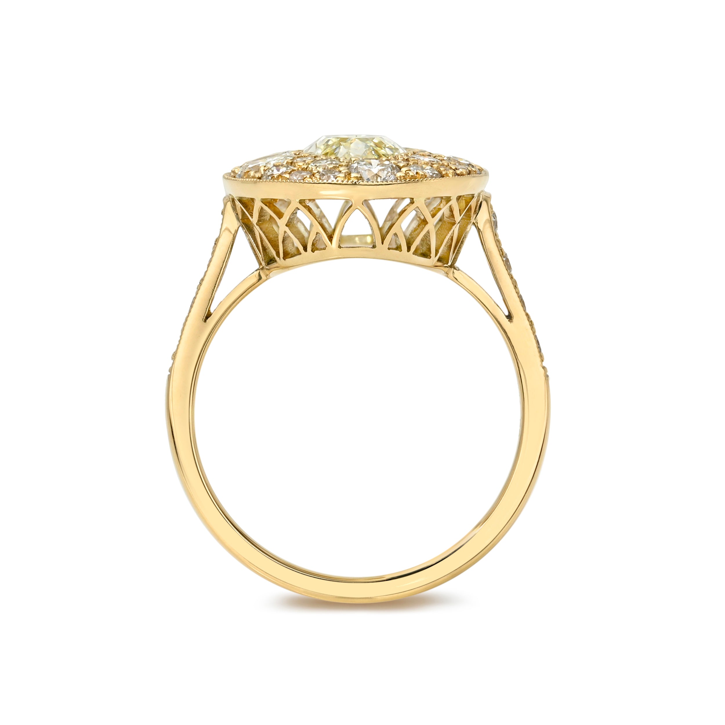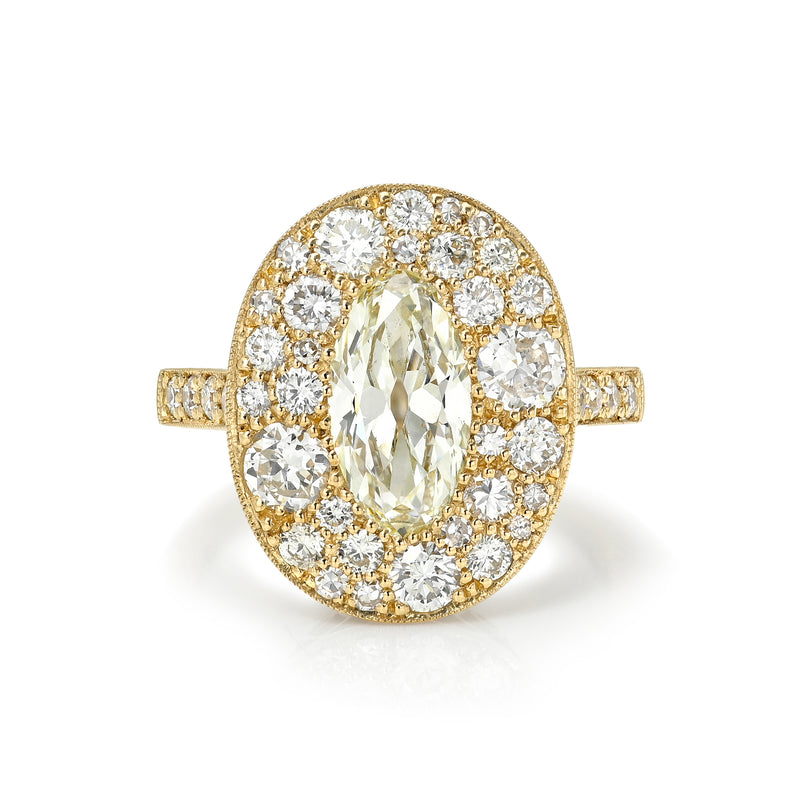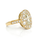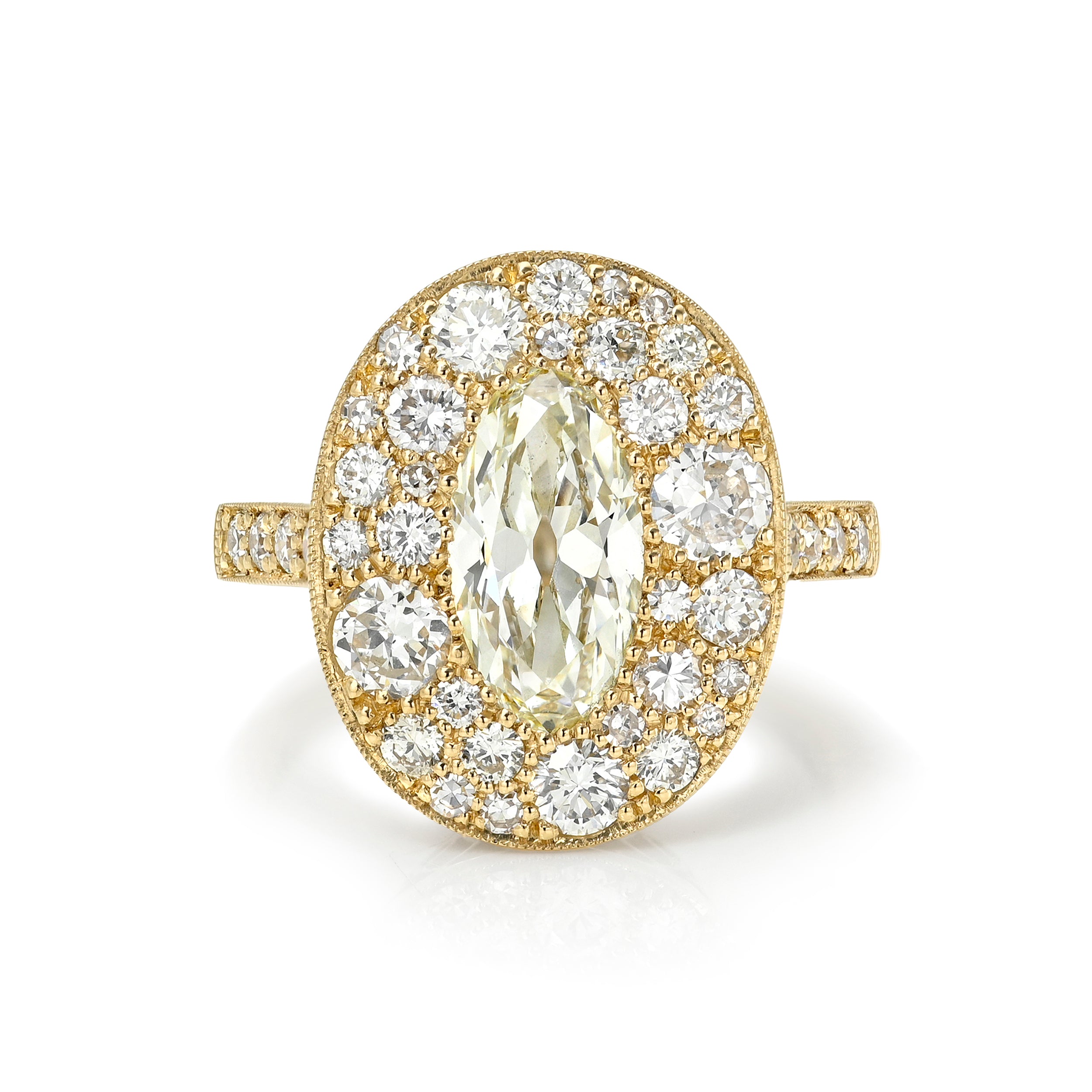 1.53ct L/SI2 GIA certified moval cut diamond prong set surrounded by 1.31ctw various old cut and round brilliant cut diamonds cobblestone set in a handcrafted 18K yellow gold mounting.